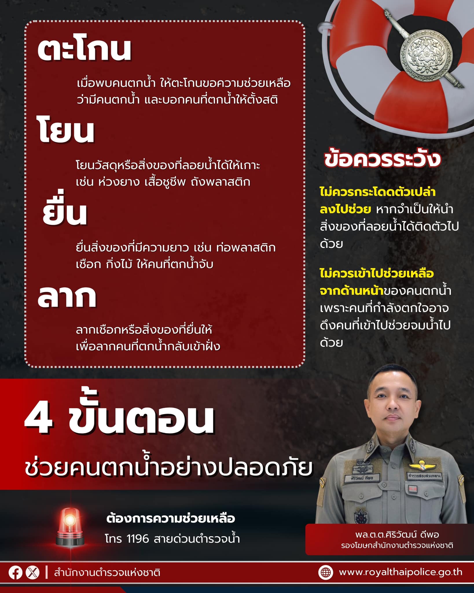 สำนักงานตำรวจแห่งชาติ แนะนำ “ตะโกน โยน ยื่น ลาก” 4 ขั้นตอนช่วยคนตกน้ำอย่างปลอดภัย