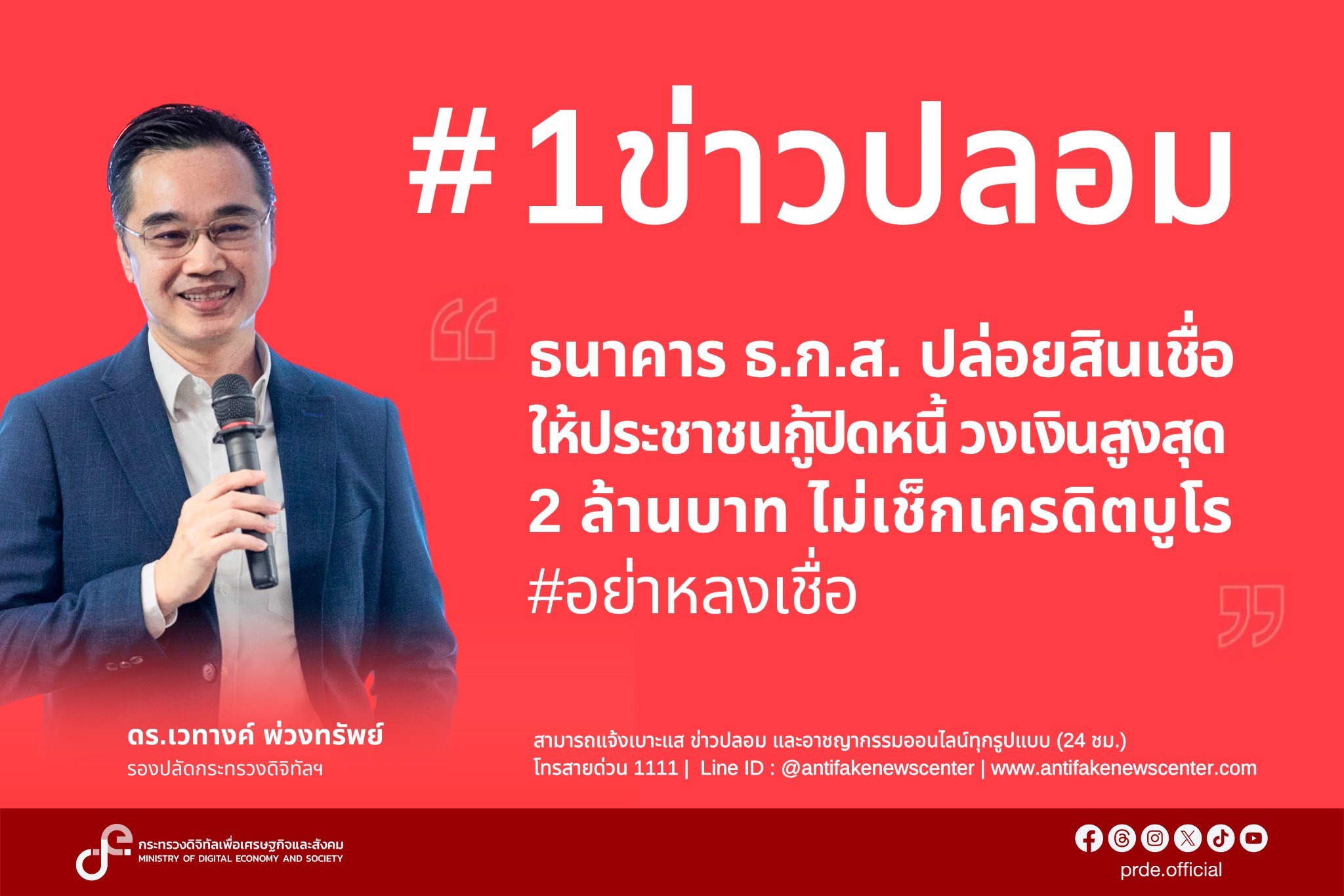 กระทรวงดิจิทัลฯ เตือน ข่าวปลอม “ธนาคาร ธ.ก.ส. ปล่อยสินเชื่อให้ประชาชนกู้ปิดหนี้ วงเงินสูงสุด 2 ล้านบาท ไม่เช็กเครดิตบูโร”