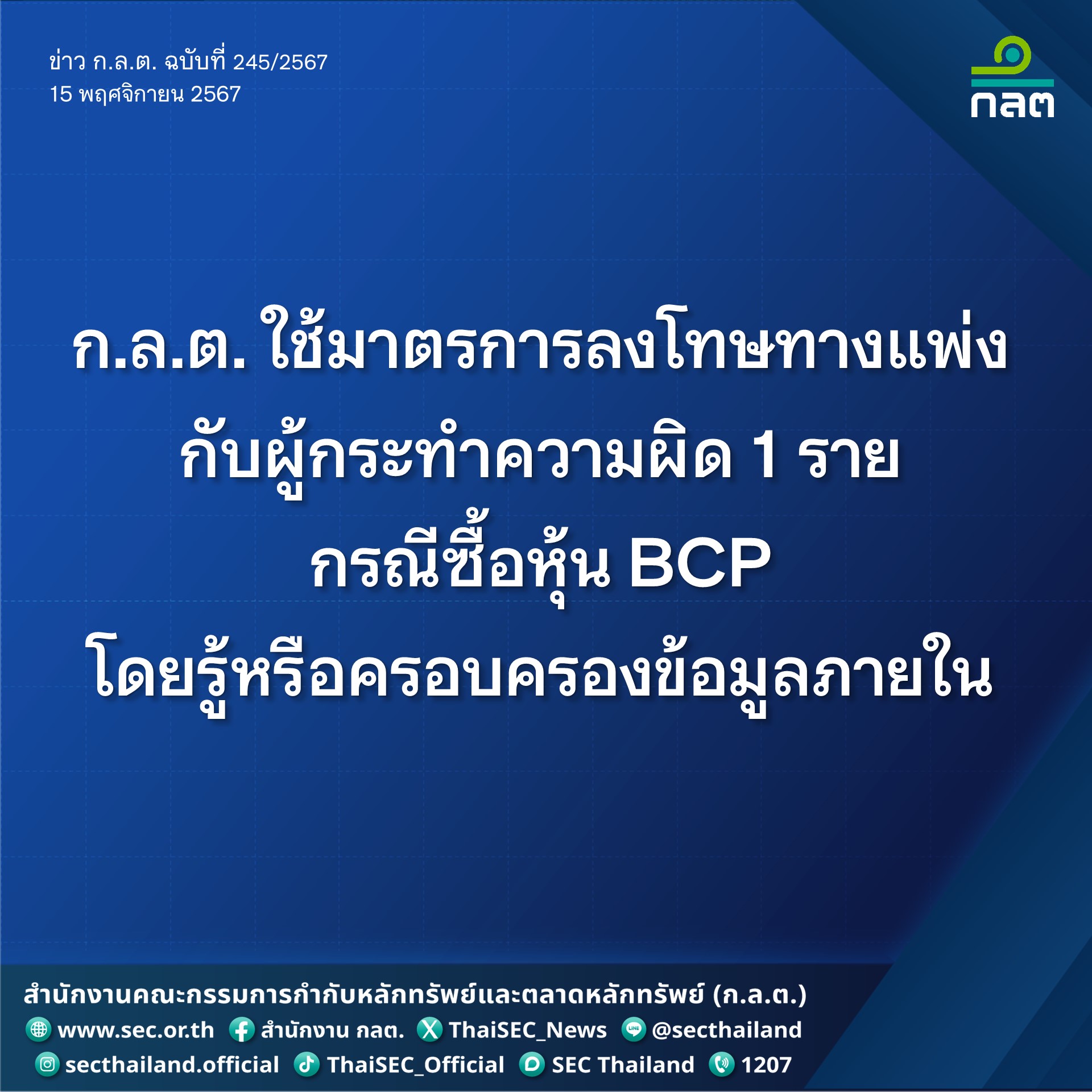 ก.ล.ต. ใช้มาตรการลงโทษทางแพ่งกับผู้กระทำความผิด 1 ราย กรณีซื้อหุ้น BCP