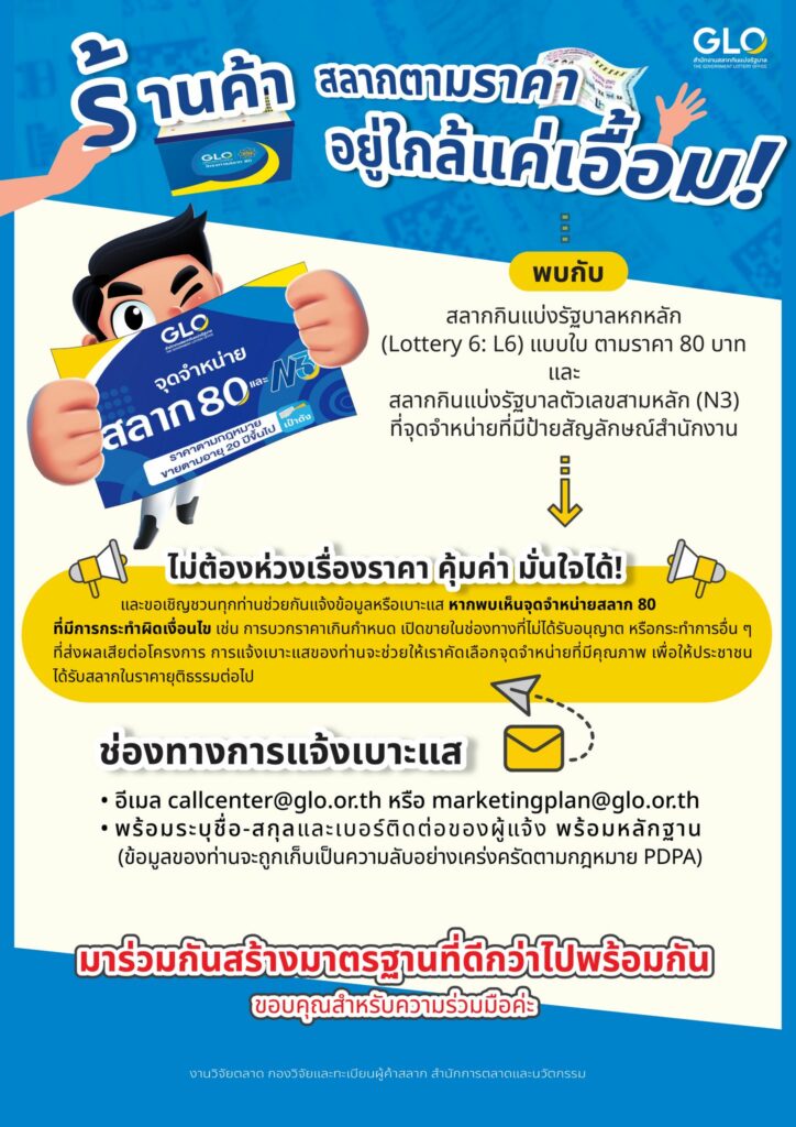 นอกจากนี้ ประชาชนทั่วไป ยังสามารถค้นหาจุดจำหน่ายโครงการสลาก 80 ซึ่งจำหน่ายสลากกินแบ่งรัฐบาลหกหลัก ตามราคาที่กฎหมายกำหนด 80 บาท รวมถึงสลาก N3 ผ่านช่องทางของสำนักงานฯอาทิ เว็บไซต์ www.glo.or.th , Facebook Fanpage สำนักงานสลากกินแบ่งรัฐบาล , LINE Official และแอปพลิเคชัน : GLO Lottery รวมถึงสอบถามได้ที่ call center 02 528 9999 อีกทั้งที่บริเวณจุดจำหน่ายโครงการสลาก 80 จะมีป้ายสัญลักษณ์สำนักงานฯ เพื่อให้มั่นใจในการเลือกซื้อ