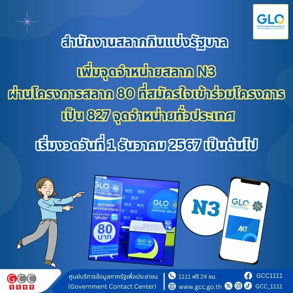 สำนักงานสลากกินแบ่งรัฐบาล เพิ่มจุดจำหน่ายสลาก N3 เป็น 827 แห่งทั่วประเทศ เริ่มตั้งแต่งวดวันที่ 1 ธันวาคม 2567 เป็นต้นไป
