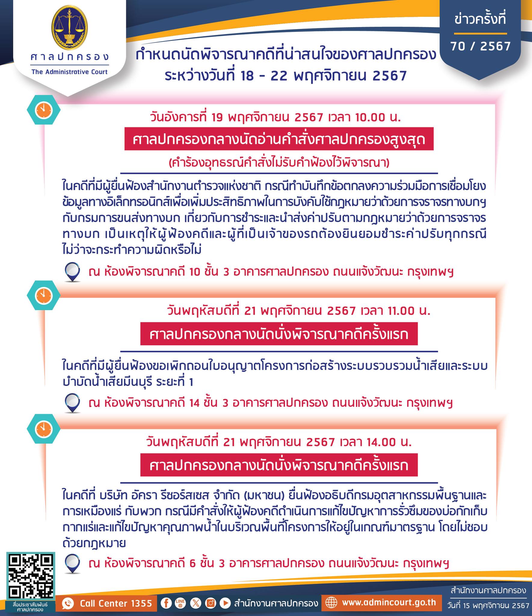กำหนดนัดพิจารณาคดีที่น่าสนใจของศาลปกครอง ระหว่างวันที่ 18 – 22 พฤศจิกายน 2567 ดังนี้