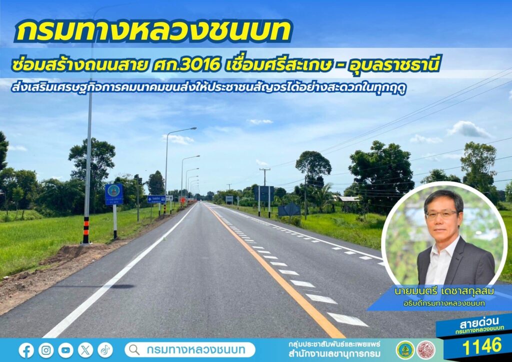กรมทางหลวงชนบท ซ่อมสร้างถนนสาย ศก.3016 เชื่อมศรีสะเกษ – อุบลราชธานี เสร็จสมบูรณ์พร้อมเปิดใช้งานแล้ว