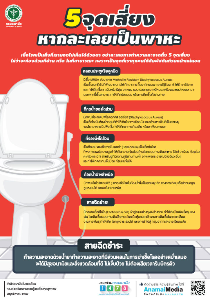 กรมอนามัย แนะนำ 5 จุดเสี่ยงห้องส้วม หากละเลยอาจเป็นพาหะ ทั้งห้องส้วมที่บ้านหรือในที่สาธารณะ