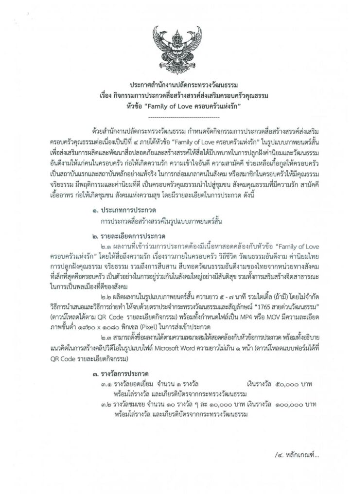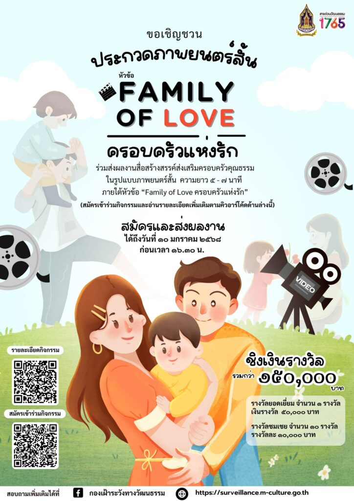 กระทรวงวัฒนธรรม ขอเชิญร่วมประกวดภาพยนตร์สั้น หัวข้อ “Family of Love ครอบครัวแห่งรัก” ชิงเงินรางวัล