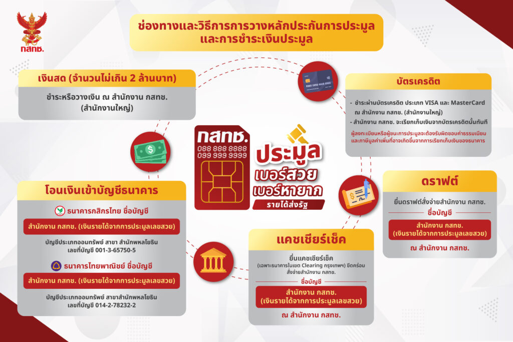 ช่องทางและวิธีการ การวางหลักประกันการประมูล “กสทช. ประมูลเบอร์สวย เบอร์หายาก รายได้ส่งรัฐ” และการชำระเงินประมูลมีรายละเอียดดังนี้: