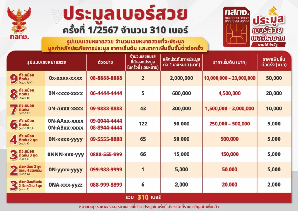 ราคาเริ่มต้นประมูลตั้งแต่ 20,000 บาทจนถึง 20,000,000 บาท โดยมีการวางหลักประกันก่อนเข้าร่วมประมูล ซึ่งต่างกันไปตามหมวดของหมายเลข