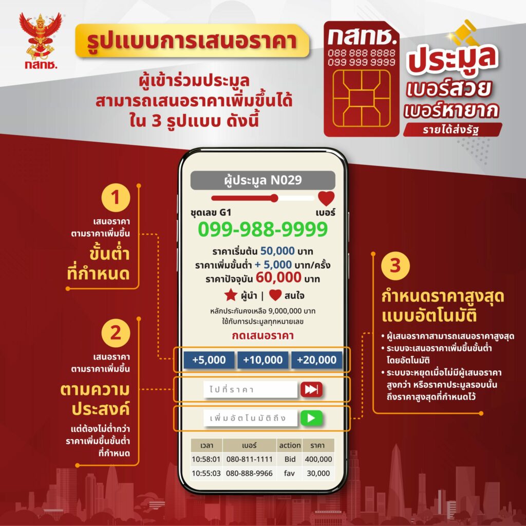 กสทช. เปิดให้ประชาชนเข้าร่วม ประมูลเบอร์สวย หลากหลายรูปแบบที่ไม่ซ้ำใคร! ไม่ว่าจะเป็นเบอร์เลขสวยแบบ 9 ตัวเหมือนติดกัน (หมวด A, H), 8 ตัวเหมือนติดกัน (หมวด B), 7 ตัวเหมือนติดกัน (หมวด C, I) และอีกมากมายเพื่อตอบโจทย์ผู้ที่ชอบตัวเลขสวยและหายาก