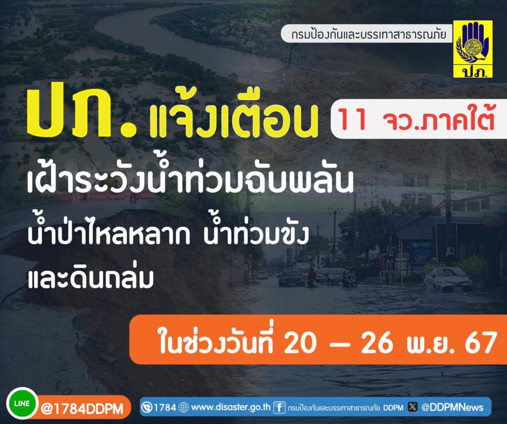 ปภ. แจ้ง 11 จังหวัดในพื้นที่ภาคใต้ เฝ้าระวังน้ำท่วมฉับพลัน น้ำป่าไหลหลาก น้ำท่วมขัง และดินถล่ม ในช่วงวันที่ 20 – 26 พฤศจิกายน 2567