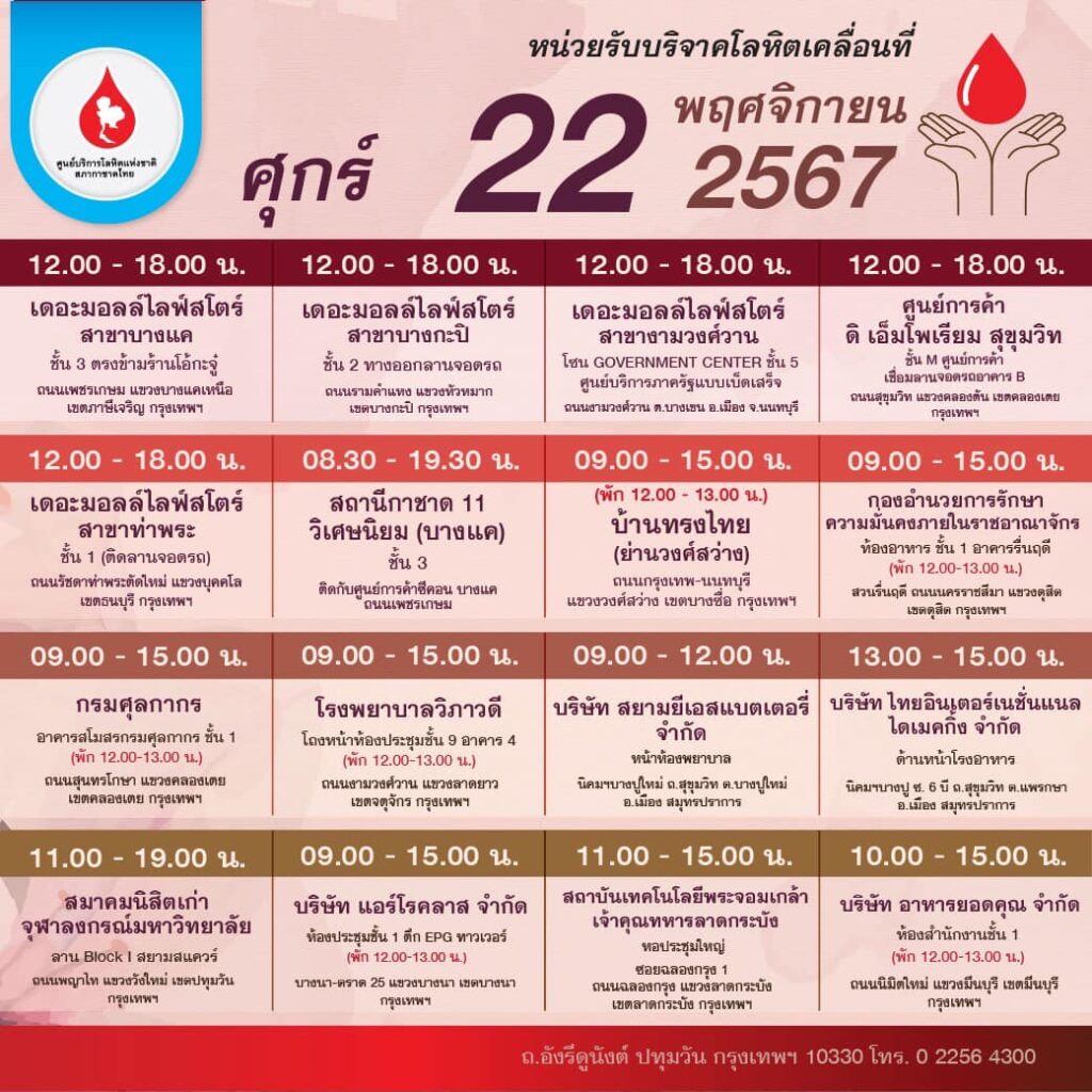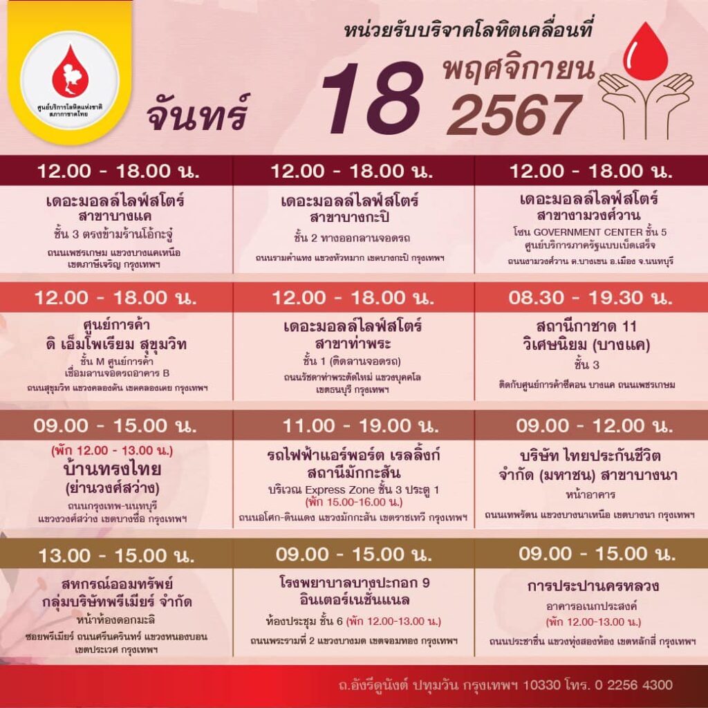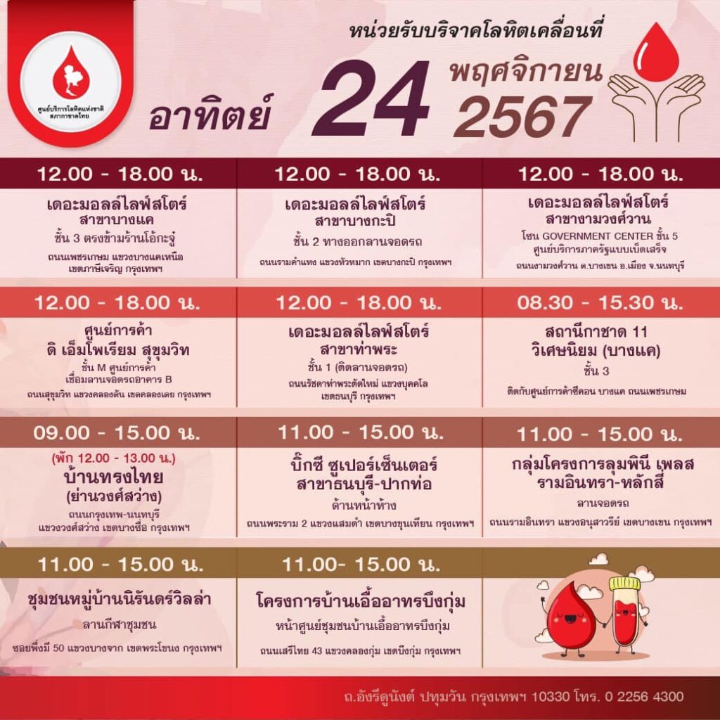 สภากาชาดไทย ออกหน่วยรับบริจาคโลหิตเคลื่อนที่ วันที่ 18 – 24 พฤศจิกายน 2567