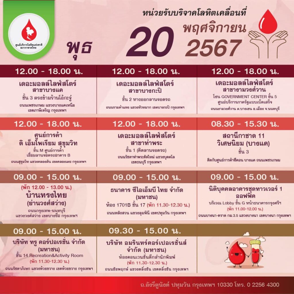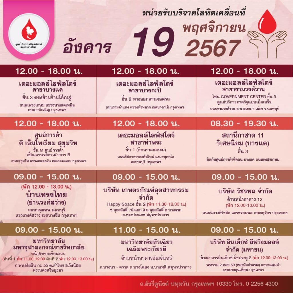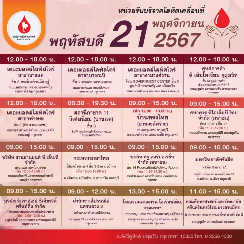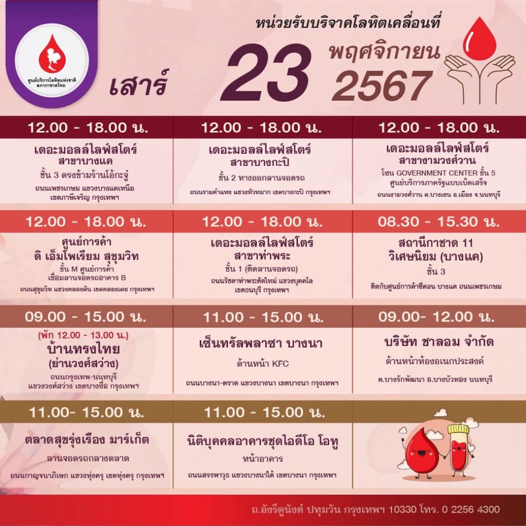 สภากาชาดไทย ออกหน่วยรับบริจาคโลหิตเคลื่อนที่ วันที่ 18 – 24 พฤศจิกายน 2567