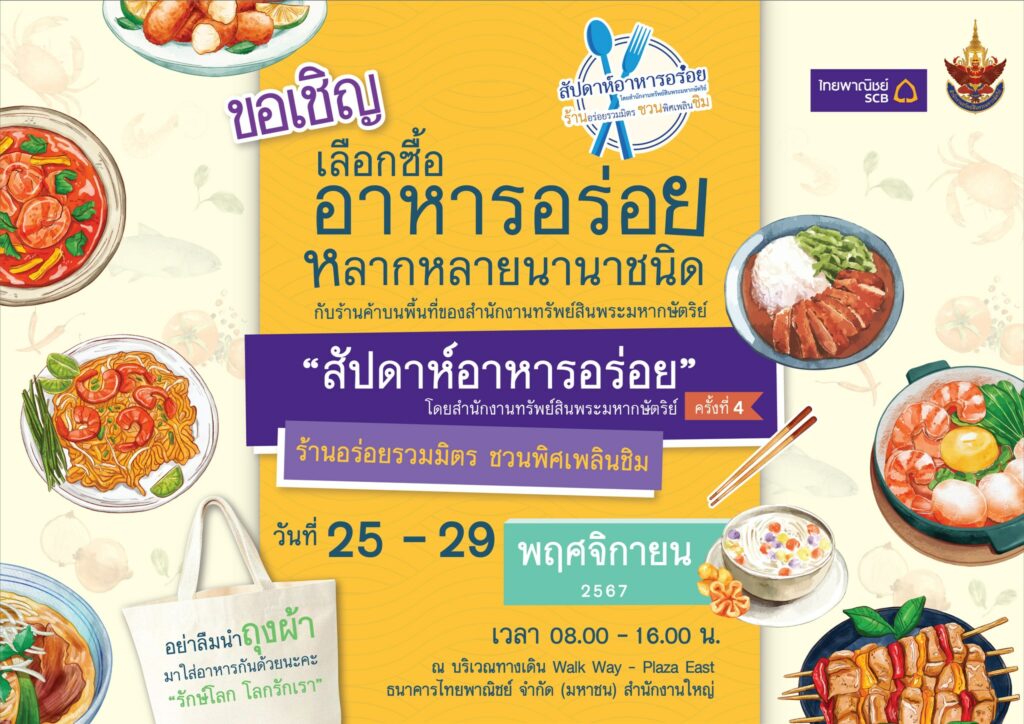 สำนักงานทรัพย์สินพระมหากษัตริย์ เชิญร่วมงาน “สัปดาห์อาหารอร่อย” ระหว่างวันที่ 25 – 29 พฤศจิกายน 2567 ข่าวสารกิจกรรม สำนักงานทรัพย์สินพระมหากษัตริย์ เชิญร่วมงาน “สัปดาห์อาหารอร่อย” ระหว่างวันที่ 25 – 29 พฤศจิกายน 2567 สำนักงานทรัพย์สินพระมหากษัตริย์ ร่วมกับ ธนาคารไทยพาณิชย์ จำกัด (มหาชน) ขอเชิญเลือกซื้ออาหารอร่อยหลากหลายนานาชนิดกับร้านค้าบนพื้นที่ของสำนักงานทรัพย์สินฯ ในงาน “สัปดาห์อาหารอร่อย” ครั้งที่ 4 ระหว่างวันที่ 25 – 29 พฤศจิกายน 2567 เวลา 08.00 – 16.00 น. ณ บริเวณทางเดิน Walk Way – Plaza East ธนาคารไทยพาณิชย์ จำกัด (มหาชน) สำนักงานใหญ่ ที่มา : https://citly.me/6KCXY Post Views: 11 FacebookFacebookXTwitterLINELine