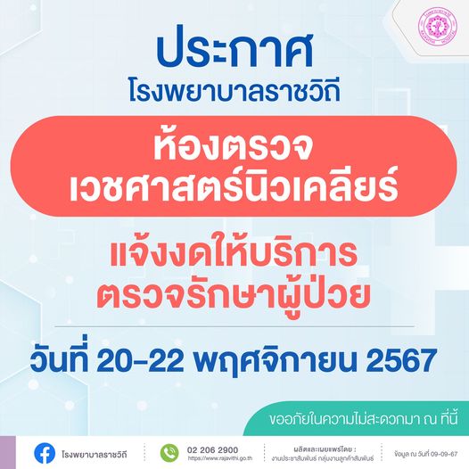 โรงพยาบาลราชวิถี แจ้ง “ห้องตรวจเวชศาสตร์นิวเคลียร์” งดให้บริการตรวจรักษาผู้ป่วย ในวันที่ 20 – 22 พฤศจิกายน 2567