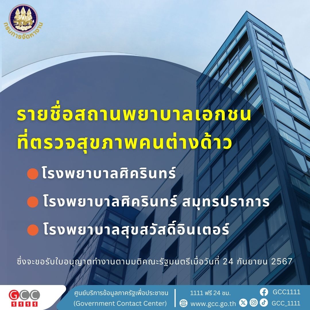 บัดนี้ มีสถานพยาบาลเอกชนที่ผ่านการตรวจพิจารณาหลักเกณฑ์ของสถานพยาบาลเอกชนที่จะตรวจสุขภาพคนต่างด้าวซึ่งจะขอรับใบอนุญาตทำงานตามมติคณะรัฐมนตรีเมื่อวันที่ 24 กันยายน 2567 ตามที่กรมการจัดหางานกำหนด และมีการเชื่อมโยงข้อมูลผลการตรวจสุขภาพกับระบบของกรมการจัดหางาน ดังนั้น เพื่อให้คนต่างด้าว นายจ้าง ตลอดจนผู้ที่เกี่ยวข้องได้รับทราบข้อมูล รวมทั้งสามารถพิจารณาเลือกสถานพยาบาลเอกชนในการตรวจสุขภาพ กรมการจัดหางานจึงขอประกาศรายชื่อสถานพยาบาลเอกชนที่ตรวจสุขภาพคนต่างด้าวซึ่งจะขอรับใบอนุญาตทำงานตามมติคณะรัฐมนตรีเมื่อวันที่ 24 กันยายน 2567 ได้แก่ สถานพยาบาลเอกชน ดังต่อไปนี้