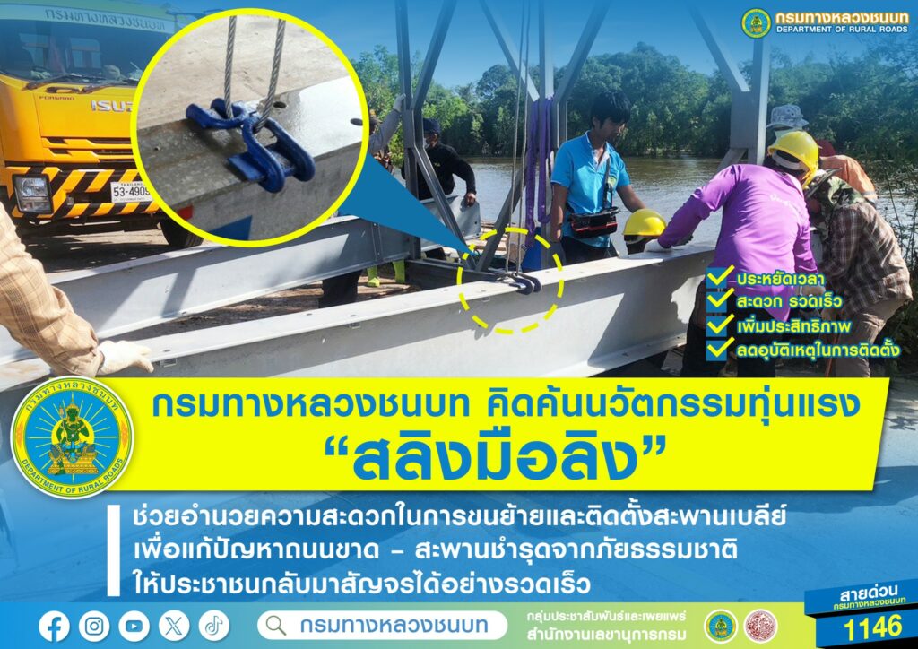 นายมนตรี เดชาสกุลสม อธิบดีกรมทางหลวงชนบท เปิดเผยว่า ช่วงสถานการณ์อุทกภัยที่ผ่านมา ถนนทางหลวงชนบทได้รับผลกระทบทั้งถนนทรุดตัวและคอสะพานชำรุด ส่งผลให้ประชาชนได้รับผลกระทบไม่สามารถสัญจรไป – มาได้ตามปกติ กรมทางหลวงชนบท (ทช.) จึงได้ดำเนินการติดตั้งสะพานเหล็กสำเร็จรูป (Bailey Bridge) เพื่อแก้ไขปัญหาการสัญจรให้กับประชาชนสามารถกลับมาใช้เส้นทางได้เป็นการชั่วคราวอย่างไรก็ตาม ด้วยชิ้นส่วนที่มีขนาดใหญ่และน้ำหนักที่มากของสะพานเหล็กสำเร็จรูป การดำเนินการขนย้ายและติดตั้งในแต่ละครั้งจำเป็นต้องใช้กำลังคนและระยะเวลานาน ดังนั้นเพื่ออำนวยความสะดวกและแก้ไขปัญหาอย่างเร่งด่วนให้กับประชาชนในภาวะวิกฤต ทช. โดยสำนักงานทางหลวงชนบทที่ 16 (กาฬสินธุ์) จึงได้คิดค้นนวัตกรรมทุ่นแรง “สลิงมือลิง” ขึ้น เพื่ออำนวยความสะดวกในขนย้ายและติดตั้งสะพานเหล็กสำเร็จรูป