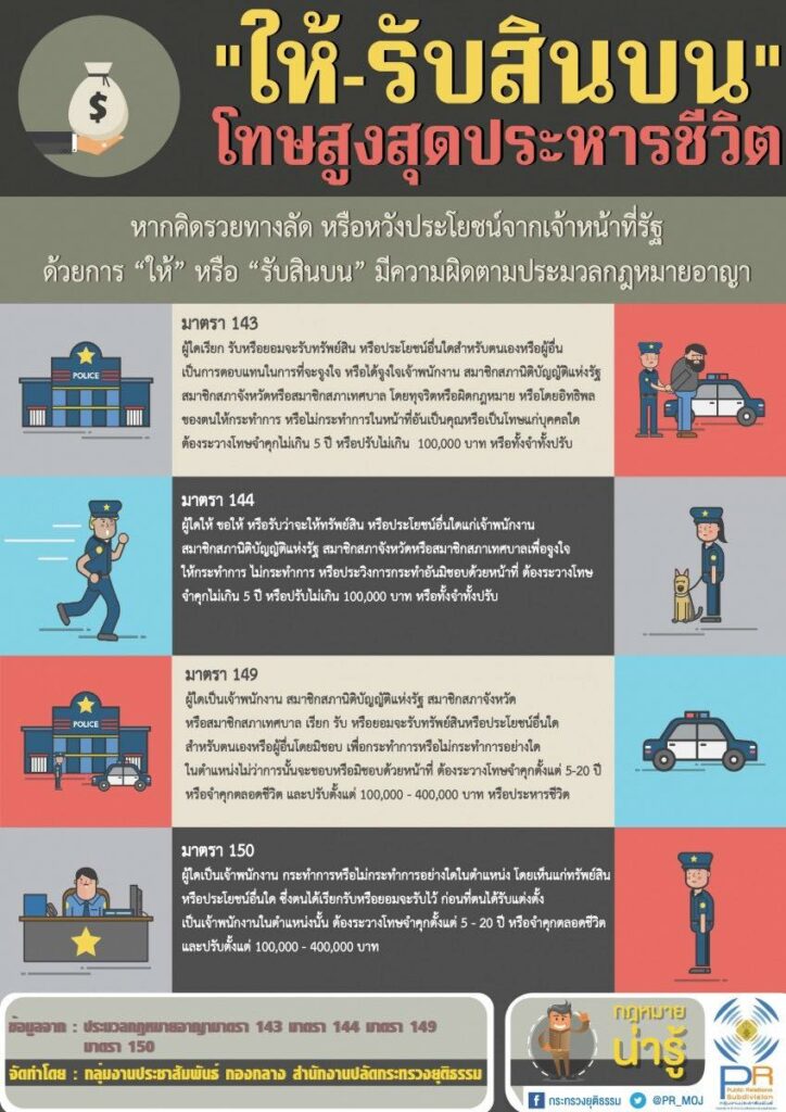 กระทรวงยุติธรรม เตือน หากคิดรวยทางลัด หรือหวังประโยชน์จากเจ้าหน้าที่รัฐด้วยการ “ให้” หรือ “รับสินบน” มีความผิดตามประมวลกฎหมายอาญา