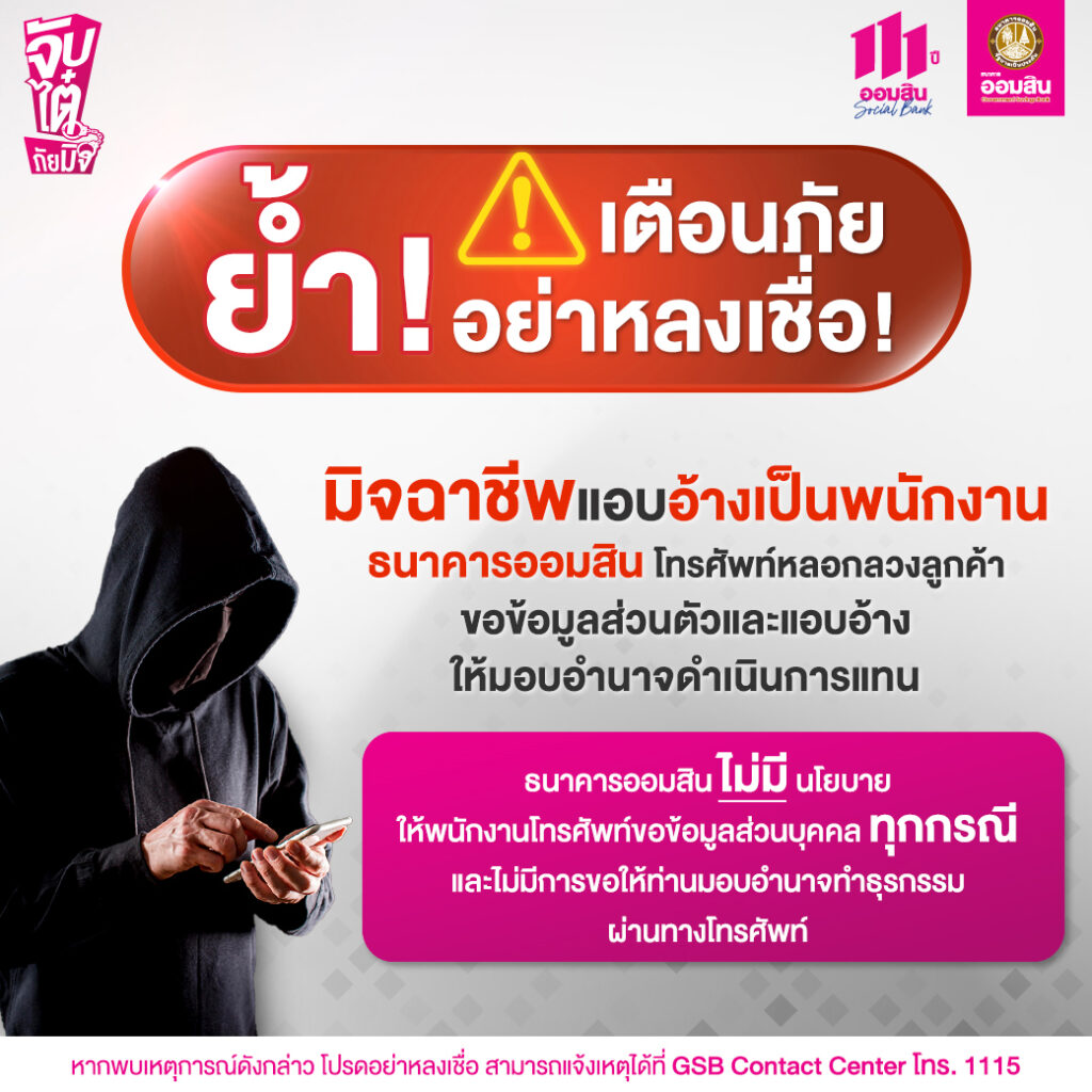 ธนาคารออมสิน เตือนภัย มิจฉาชีพแอบอ้างเป็นพนักงานธนาคารออมสิน อย่าหลงเชื่อ มิจฉาชีพแอบอ้างเป็นพนักงานธนาคารออมสิน และโทรศัพท์หลอกลวงลูกค้า เพื่อขอข้อมูลส่วนตัวและแอบอ้างให้มอบอำนาจดำเนินการแทน