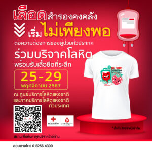 ศูนย์บริการโลหิตแห่งชาติ ขอเชิญชวนผู้ใจบุญที่มีสุขภาพดี รวมพลังบริจาคโลหิต เปลี่ยนสัญญาณโลหิตคงคลังจากระดับสีเหลือง ให้เป็นระดับสีเขียว โดยร่วมบริจาคโลหิตเป็นประจำทุก 3 เดือน เพื่อลดวิกฤติคลังเลือดขาดแคลน พิเศษ ! ผู้บริจาคโลหิตระหว่างวันที่ 25 – 29 พฤศจิกายน 2567 ณ ศูนย์บริการโลหิตแห่งชาติ และภาคบริการโลหิตแห่งชาติ 12 แห่งทั่วประเทศ จะได้รับเสื้อยืด “Blood Donation” Give Blood Save Life เป็นที่ระลึกแทนคำขอบคุณ