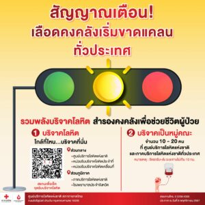 ศูนย์บริการโลหิตแห่งชาติ ขอเชิญชวนประชาชนบริจาคโลหิต เปลี่ยนวิกฤติคลังเลือดขาดแคลน จากระดับสีเหลือง ให้เป็นระดับสีเขียว เพื่อให้มีปริมาณโลหิตคงคลังเพียงพอสำหรับผู้ป่วย และผู้ที่จำเป็นต้องใช้โลหิตในการรักษาทั่วประเทศ
