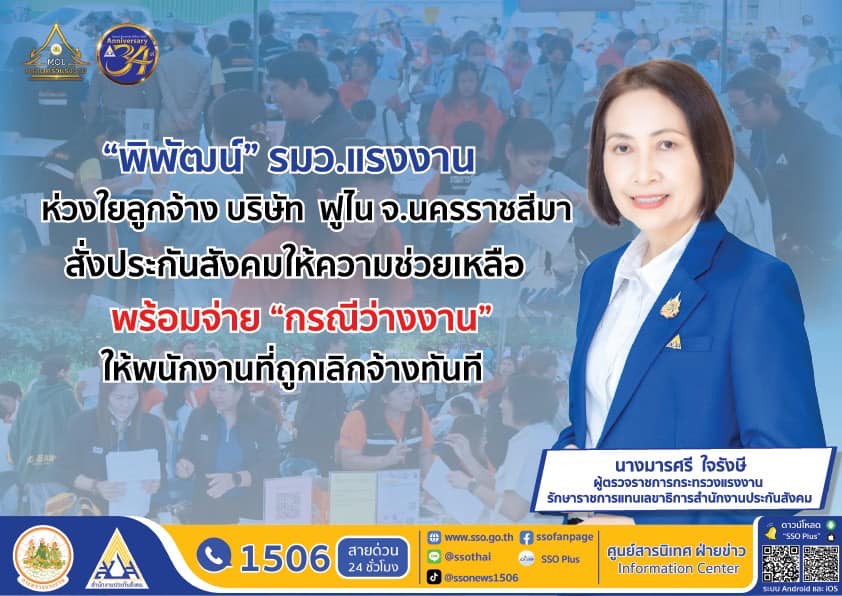 สำนักงานประกันสังคม ให้ความช่วยเหลือลูกจ้างที่ถูกเลิกจ้างของบริษัท ฟูไน (ไทยแลนด์) จำกัด พร้อมจ่าย “กรณีว่างงาน” ให้พนักงานที่ถูกเลิกจ้างทันที