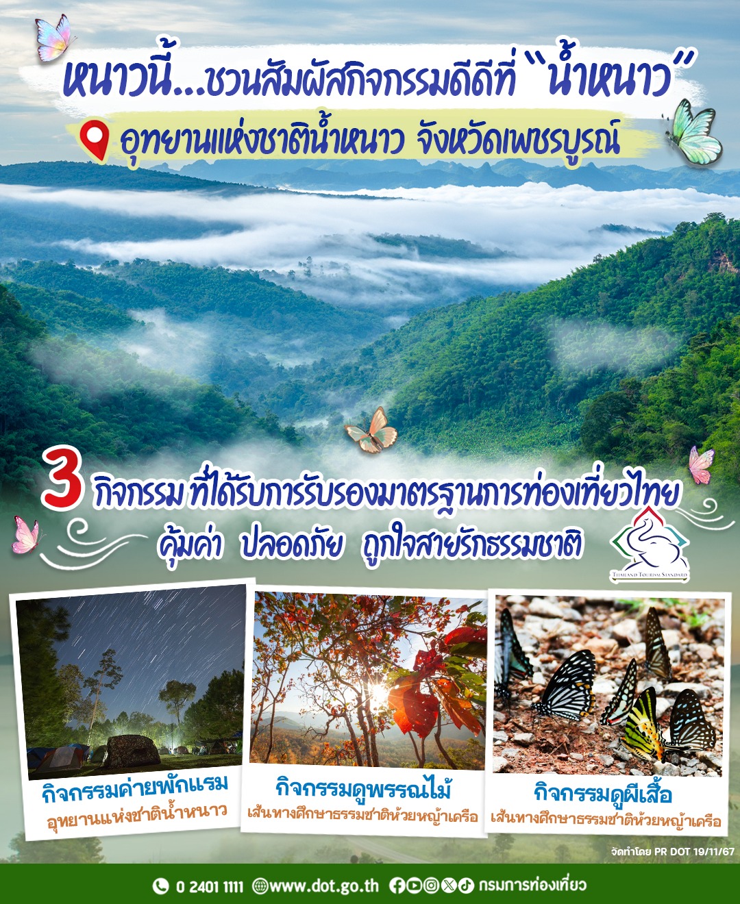 กรมการท่องเที่ยว เชิญชวนนักท่องเที่ยวร่วมสัมผัส 3 กิจกรรมในอุทยานแห่งชาติน้ำหนาว ซึ่งได้รับการรับรองมาตรฐานการท่องเที่ยวไทยจากกรมการท่องเที่ยว ได้แก่