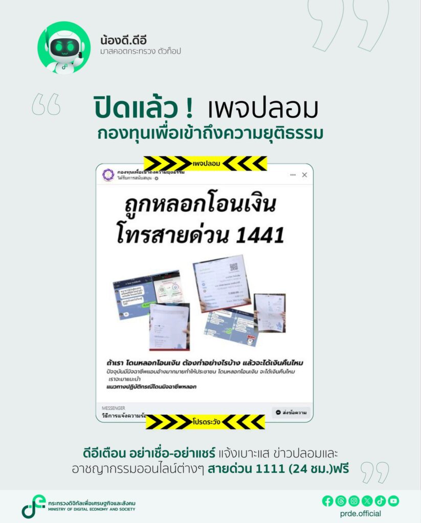 กระทรวงดิจิทัลเพื่อเศรษฐกิจและสังคม ปิดเพจปลอม กองทุนเพื่อเข้าถึงความยุติธรรม พร้อมเตือน อย่าเชื่อ-อย่าแชร์ แจ้งเบาะแสข่าวปลอมและอาชญากรรมออนไลน์ต่างๆ ได้ที่ สายด่วน 1111 (24 ชม.ฟรี)