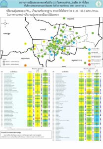 - กรุงเทพมหานครและปริมณฑล เกินค่ามาตรฐาน 1 พื้นที่ ตรวจวัดได้ 11.0 – 41.3 ไมโครกรัมต่อลูกบาศก์เมตร