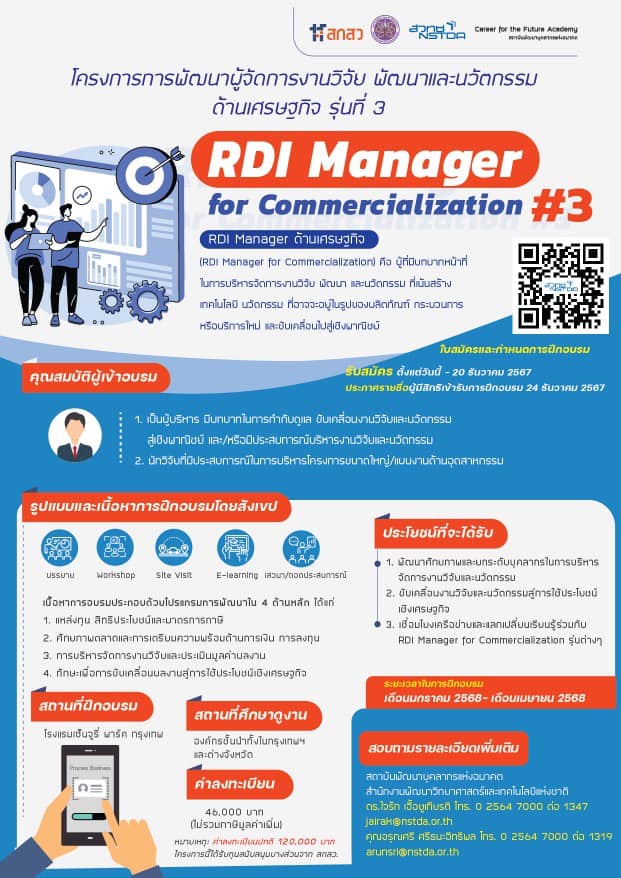 สกสว. ร่วมกับ สถาบันพัฒนาบุคลากรแห่งอนาคต สวทช. เปิดรับสมัครบุคลากรเข้าร่วมหลักสูตร “การพัฒนาผู้จัดการงานวิจัย พัฒนาและนวัตกรรม ด้านเศรษฐกิจ รุ่นที่ 3” (Research development and innovation manager for commercialization)