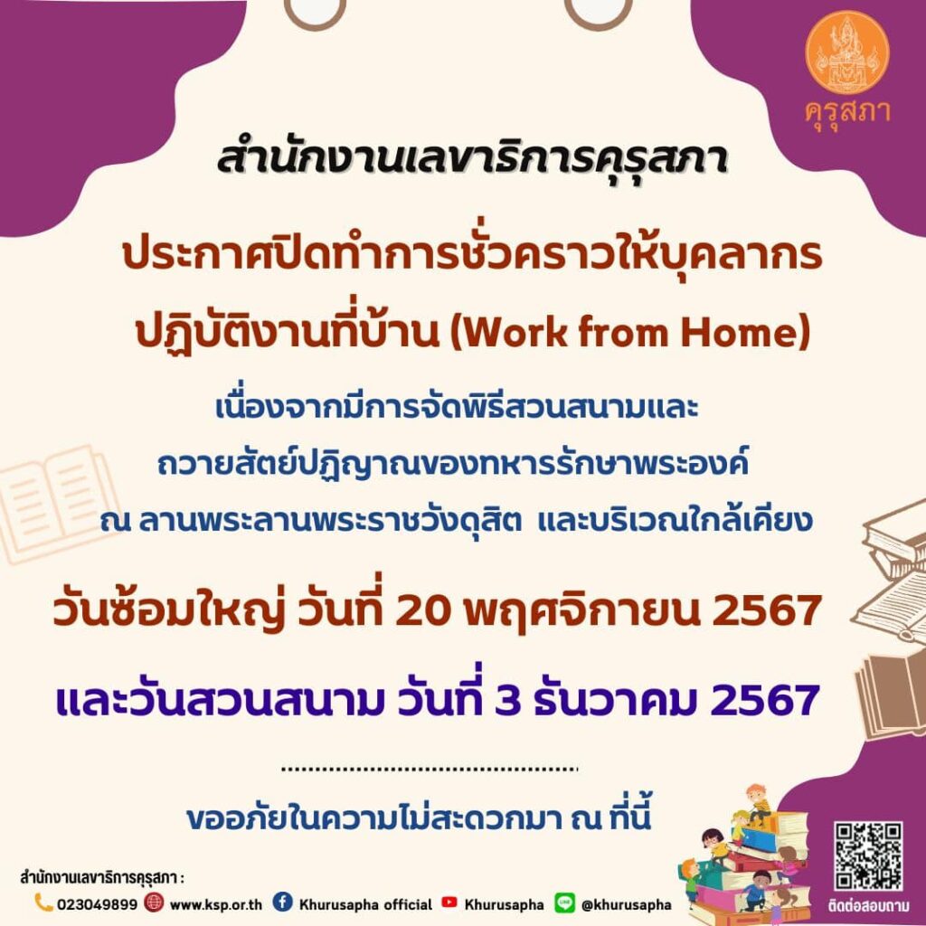 สำนักงานเลขาธิการคุรุสภา แจ้งปิดทำการชั่วคราวให้บุคลากรปฏิบัติงานที่บ้าน (Work from Home) เนื่องจากมีการจัดพิธีสวนสนามและถวายสัตย์ปฏิญาณของทหารรักษาพระองค์ ณ ลานพระลานพระราชวังดุสิต และบริเวณใกล้เคียง ในวันซ้อมใหญ่ วันที่ 20 พฤศจิกายน 2567 และวันสวนสนาม วันที่ 3 ธันวาคม 2567