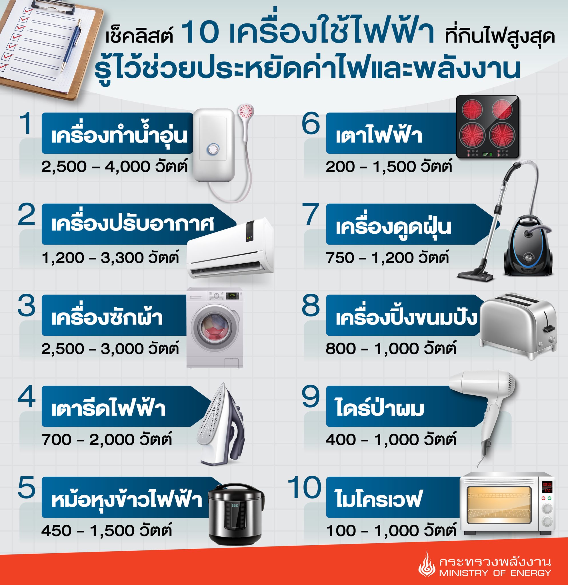 กระทรวงพลังงาน แนะนำ 10 เครื่องใช้ไฟฟ้าในคอนโดที่กินไฟสูงสุด