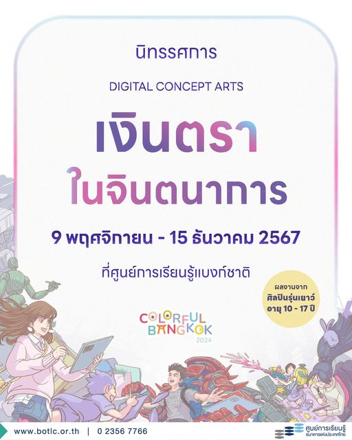 ธนาคารแห่งประเทศไทย จัดงาน “นิทรรศการ Digital Concept Arts ” เงินตราในจินตนาการ ที่รวมผลงานของศิลปินรุ่นเยาว์มาถ่ายทอดมุมมองเรื่องเงินตราผ่านงาน Digital Concept Art ตั้งแต่บัดนี้ – 15 ธันวาคม 2567 ณ ศูนย์การเรียนรู้แบงก์ชาติ ร่วมกิจกรรมฟรี ไม่ต้องลงทะเบียนล่วงหน้า ติดตามรายละเอียดและสอบถามเพิ่มเติมได้ที่ ศูนย์การเรียนรู้แบงก์ชาติ – BOTLC