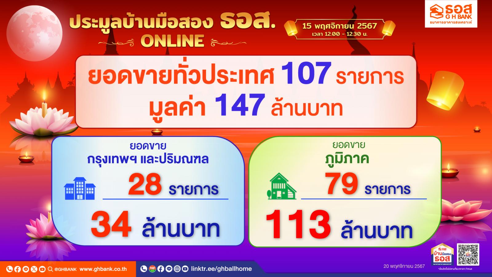 ธอส. เปิดเผยผลประมูลบ้านมือสองออนไลน์ สามารถจำหน่ายได้ 107 รายการ มูลค่ารวม 147 ล้านบาท