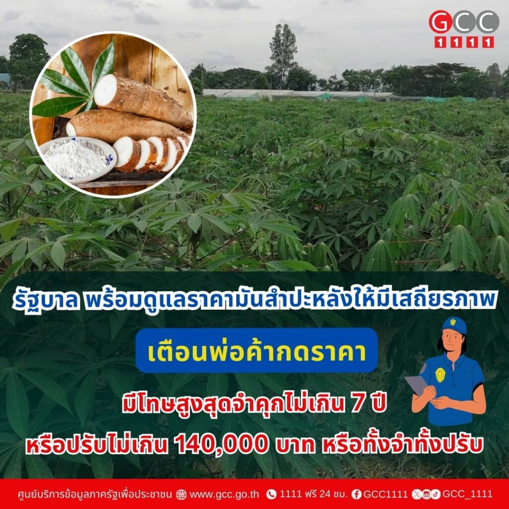 รัฐบาล ให้ความเชื่อมั่นผู้ปลูกมันสำปะหลัง เตือนพ่อค้ากดราคา โทษจำคุกสูงสุด 7 ปี จัดสายตรวจเฉพาะกิจ ลงพื้นที่ตรวจสอบการซื้อขายมันสำปะหลังในแหล่งเพาะปลูกทั่วประเทศ