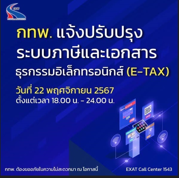 กทพ. แจ้งปรับปรุงระบบภาษีและเอกสารธุรกรรมอิเล็กทรอนิกส์ (E-TAX) วันที่ 22 พ.ย. 67
