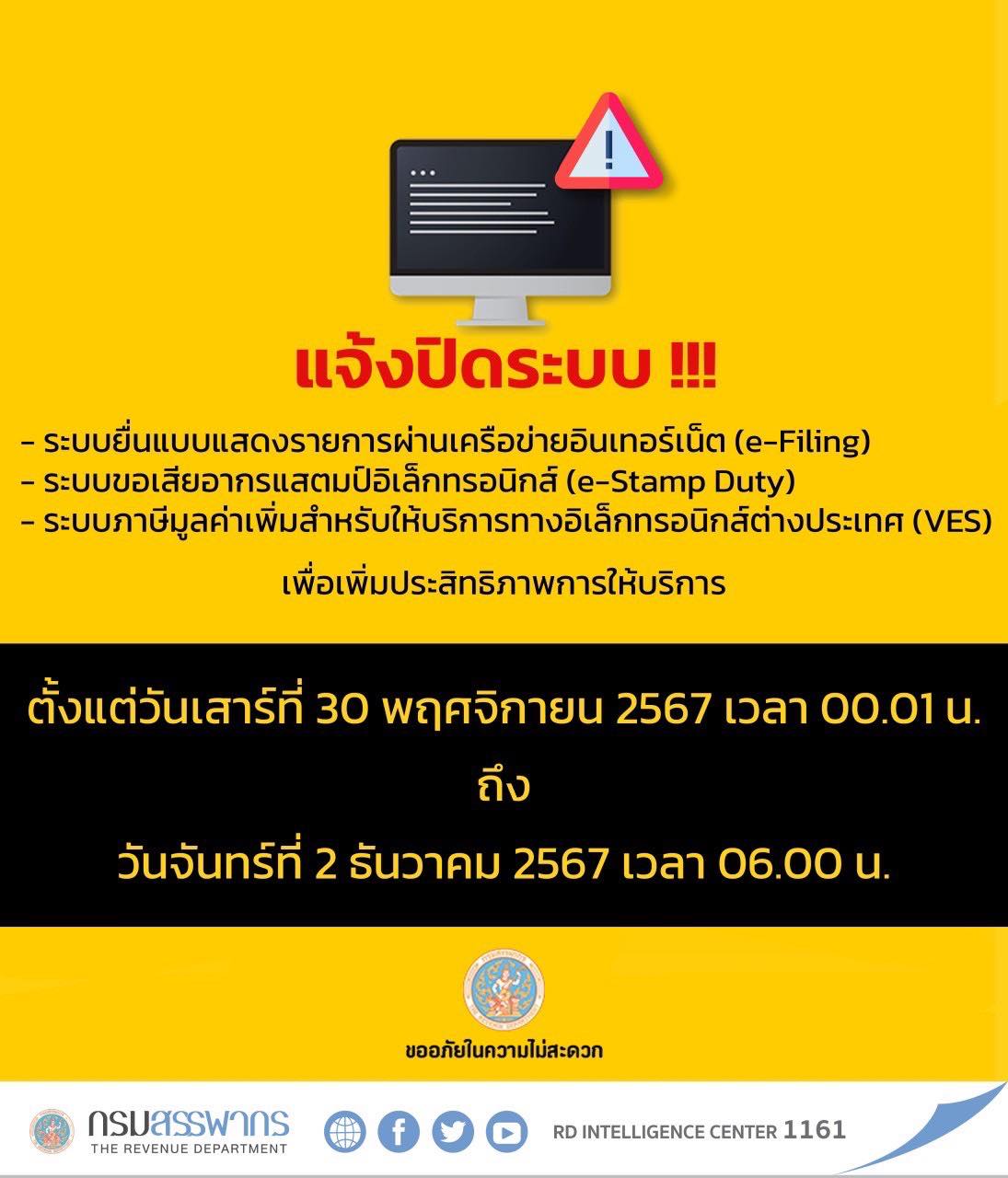 กรมสรรพากร แจ้งปิดปรับปรุงระบบ e-Filing , e-Stamp Duty และ VES ชั่วคราว วันที่ 30 พ.ย. – 2 ธ.ค. 67