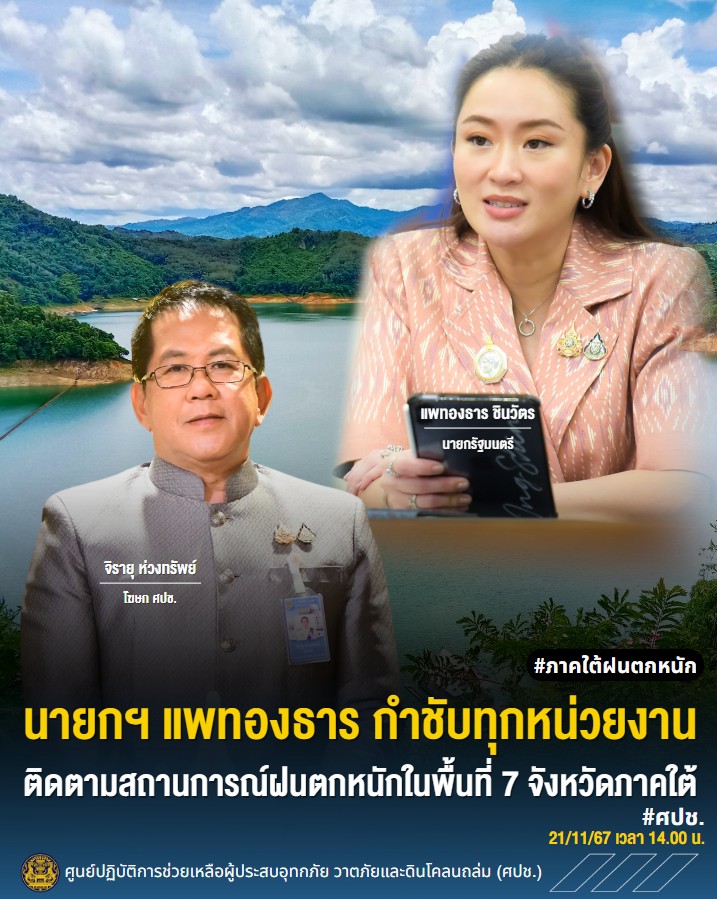 ทั้งนี้ น.ส.แพทองธาร ชินวัตร นายกรัฐมนตรี ได้รับรายงานจาก ศปช. แล้วเช้านี้ โดยสั่งการให้ ติดตามสถานการณ์สภาพอากาศของประเทศอย่างใกล้ชิด พร้อมกำชับให้หน่วยงานต่าง ๆ ดำเนินการเตรียมความพร้อม โดยเฉพาะในพื้นที่ภาคใต้ที่ในช่วงนี้ต้องติดตามและเฝ้าระวังฝนตกหนักถึงหนักมาก และฝนที่ตกสะสม ซึ่งอาจทำให้เกิดน้ำท่วมฉับพลัน น้ำป่าไหลหลากได้ แม้พายุ “MAN-YI” จะสลายตัวลงไปแล้ว“