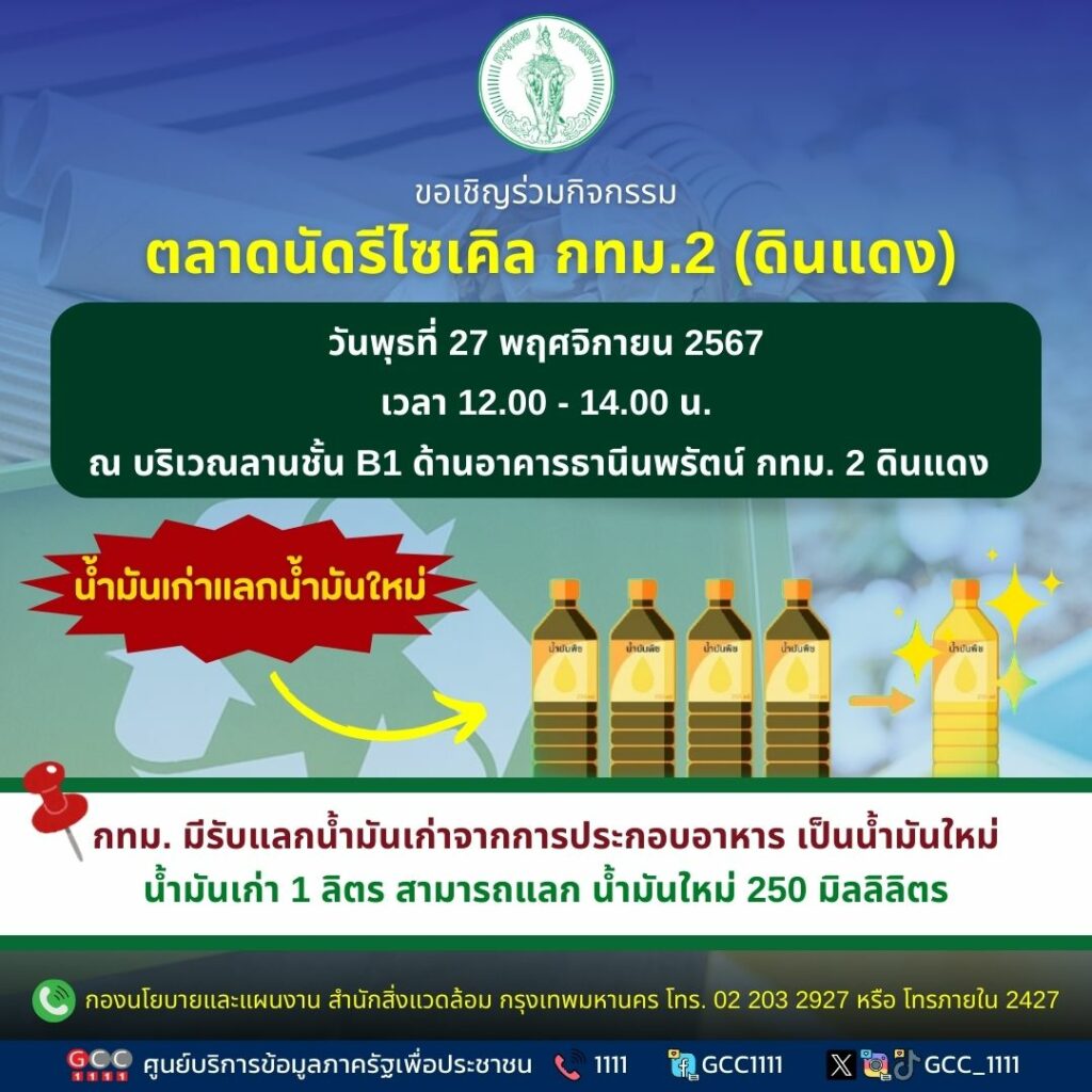 - สำนักสิ่งแวดล้อม ชวนนำขยะรีไซเคิลมาเปลี่ยนเป็นเงินในตลาดนัดรีไซเคิล กทม.2 (ดินแดง) วันพุธที่ 27 พฤศจิกายน 2567 ระหว่างเวลา 12.00 – 14.00 น. ณ บริเวณลานชั้น B1 ด้านอาคารธานีนพรัตน์ กทม. 2 ดินแดง ทั้งนี้ กทม.มีรับแลกน้ำมันเก่าจากการประกอบอาหาร เป็นน้ำมันใหม่