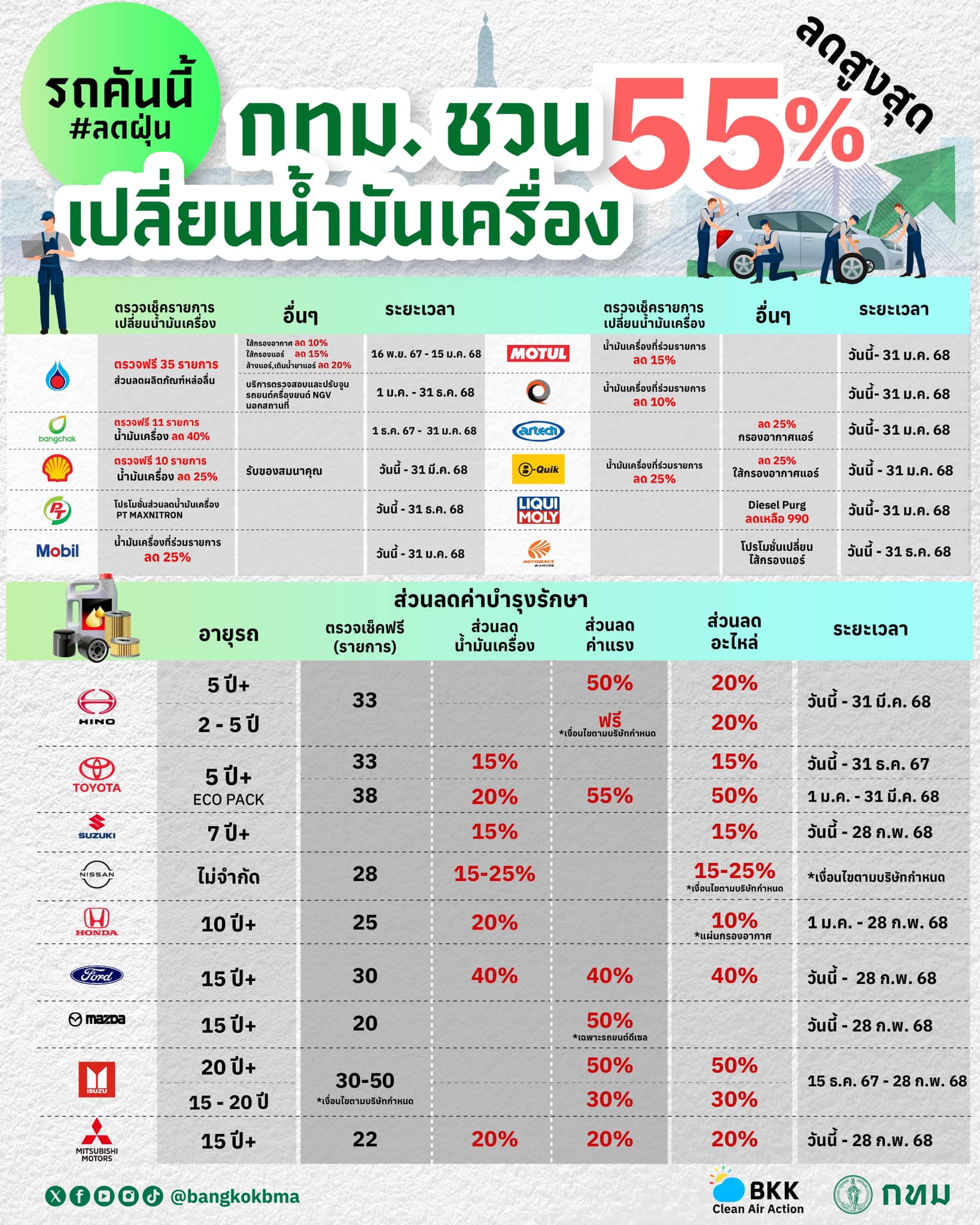 กรุงเทพมหานคร จัดโปรโมชั่นลดค่าบริการการตรวจสอบสภาพรถ ทั้งการเปลี่ยนไส้กรองอากาศ ไส้กรองน้ำมัน ฯลฯ คาดสามารถลดฝุ่น PM2.5 โดยเฉพาะพื้นที่กรุงเทพมหานครและหัวเมืองใหญ่ทั่วประเทศ เพื่อคุณภาพชีวิตคนกรุงเทพฯ และทุกจังหวัดที่ได้รับผลกระทบจาก PM2.5 ดีขึ้น ตั้งแต่เดือนธันวาคม 2567 ถึงเดือนมีนาคม 2568