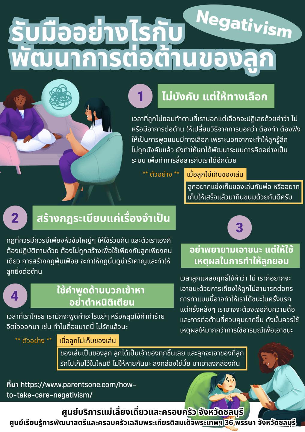 - ไม่บังคับ แต่ให้ทางเลือก เวลาที่ลูกไม่ยอมทําตามที่เราบอกแต่เลือกจะปฏิเสธด้วยคําว่า ไม่ หรือมีอาการต่อต้าน ให้เปลี่ยนวิธีจากการบอกว่า ต้องทํา ต้องฟัง ให้เป็นการพูดแบบมีทางเลือก เพราะนอกจากจะทําให้ลูกรู้สึก ไม่ถูกบังคับแล้ว ยังทําให้เขาได้พัฒนาระบบการคิดอย่างเป็น ระบบ เพื่อทําการสื่อสารกับเราได้อีกด้วย