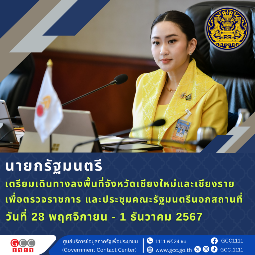 วันนี้ (23 พ.ย. 67) นายจิรายุ ห่วงทรัพย์ โฆษกประจำสำนักนายกรัฐมนตรี เปิดเผยว่า นางสาวแพทองธาร ชินวัตร นายกรัฐมนตรี เตรียมเดินทางลงพื้นที่จังหวัดเชียงใหม่และเชียงราย เพื่อตรวจราชการ และเป็นประธานการประชุมคณะรัฐมนตรีอย่างเป็นทางการนอกสถานที่ ครั้งที่ 1/2567 ในวันที่ 28 พฤศจิกายน – 1 ธันวาคม 2567 ทำให้ต้องเลื่อนการประชุมคณะรัฐมนตรี จากวันอังคารที่ 26 พฤศจิกายน 2567 เป็นวันศุกร์ที่ 29 พฤศจิกายน 2567