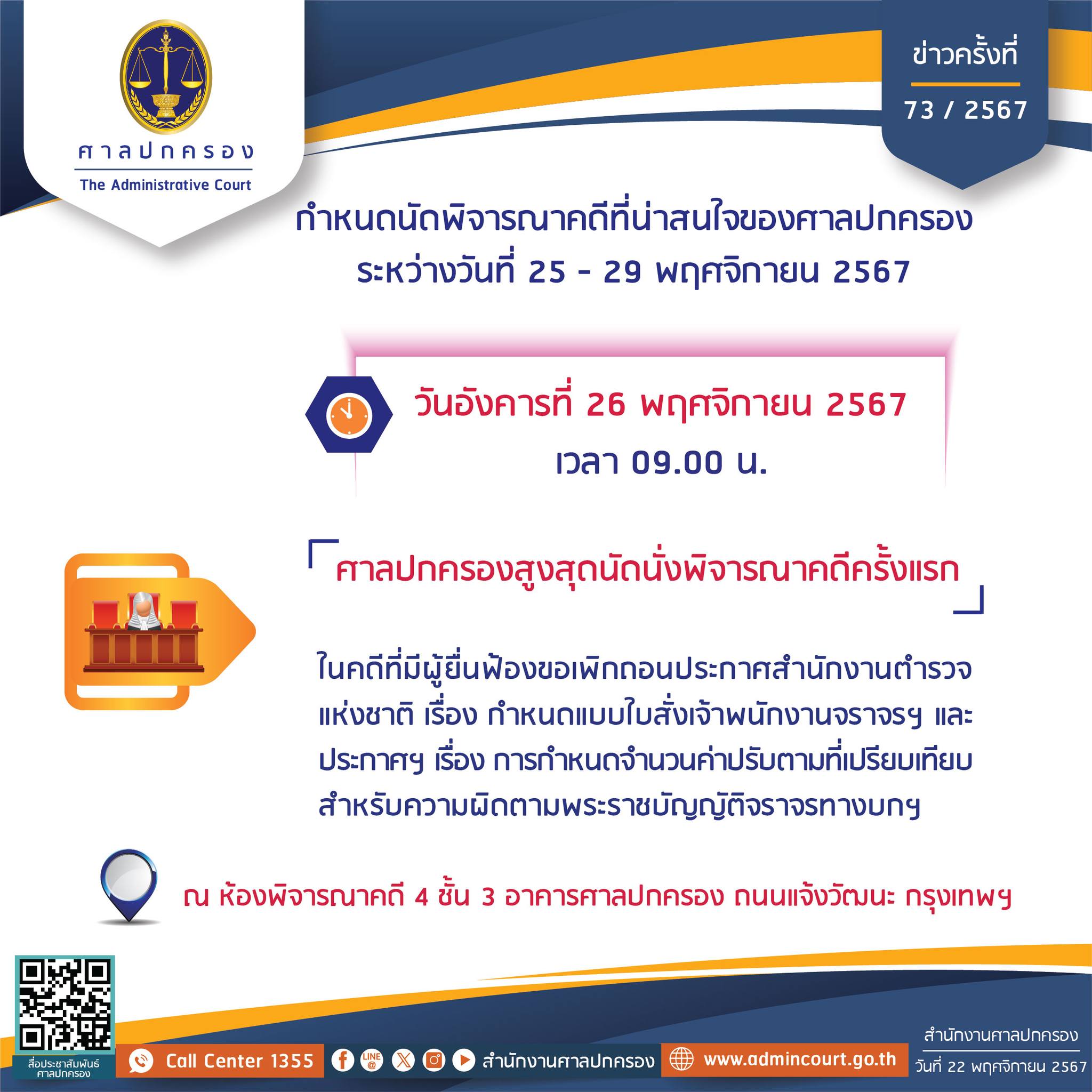 กำหนดนัดพิจารณาคดีที่น่าสนใจของศาลปกครอง ระหว่างวันที่ 25 – 29 พฤศจิกายน 2567 ดังนี้ วันอังคารที่ 26 พฤศจิกายน 2567 เวลา 09.00 น. ศาลปกครองสูงสุดนัดนั่งพิจารณาคดีครั้งแรกในคดีที่มีผู้ยื่นฟ้องขอเพิกถอนประกาศสำนักงานตำรวจแห่งชาติ เรื่อง กำหนดแบบใบสั่งเจ้าพนักงานจราจรฯ และประกาศฯ เรื่อง การกำหนดจำนวนค่าปรับตามที่เปรียบเทียบสำหรับความผิดตามพระราชบัญญัติจราจรทางบกฯ ณ ห้องพิจารณาคดี 4 ชั้น 3 อาคารศาลปกครอง ถนนแจ้งวัฒนะ กรุงเทพฯ