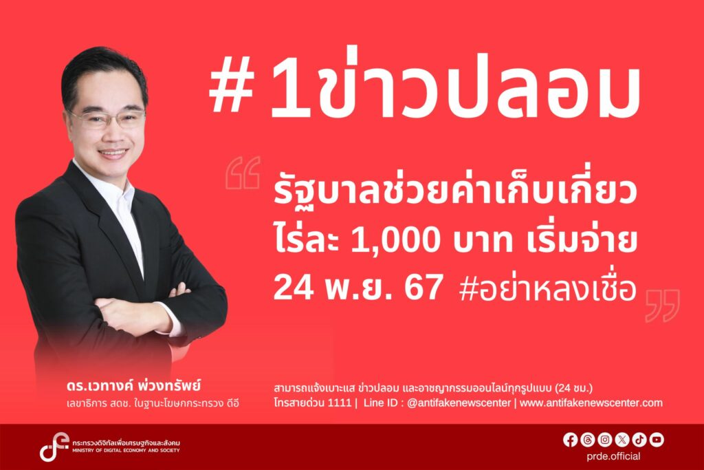 ดีอี เตือนข่าวปลอม “รัฐบาลช่วยค่าเก็บเกี่ยวไร่ละ 1,000 บาท เริ่มจ่าย 24 พ.ย. 67” ขออย่าเชื่อ-แชร์