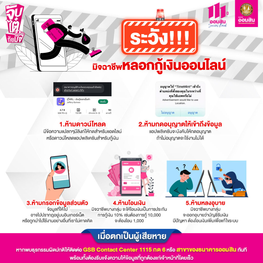 ธนาคารออมสิน เตือนระวังมิจฉาชีพหลอกให้โอนเงิน เมื่อตกเป็นผู้เสียหาย หรือพบการทำธุรกรรมผิดปกติให้ติดต่อ GSB Contact Center 1115 กด 6 หรือสาขาของธนาคารออมสินทันที