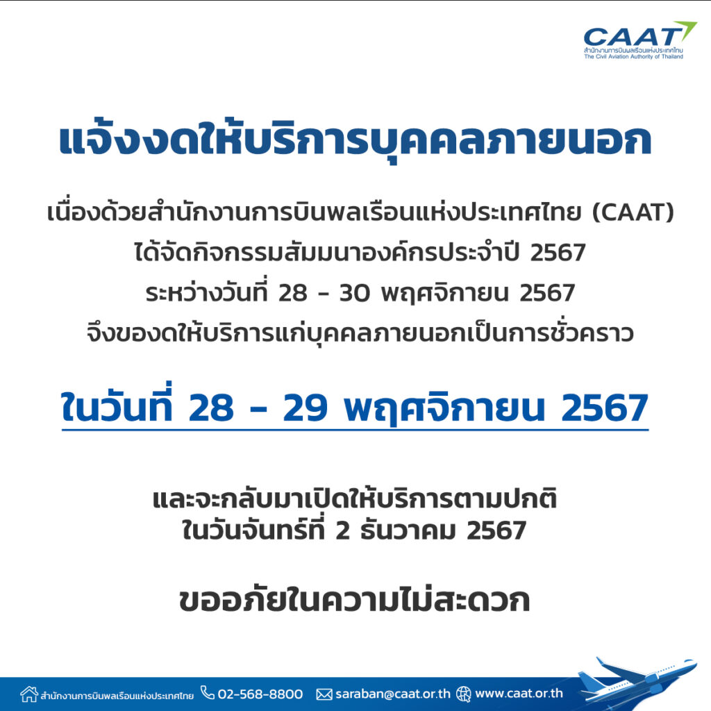 CAAT แจ้งงดให้บริการบุคคลภายนอกเป็นการชั่วคราว ในวันที่ 28 – 29 พฤศจิกายน 2567 ข่าวสารกิจกรรม CAAT แจ้งงดให้บริการบุคคลภายนอกเป็นการชั่วคราว ในวันที่ 28 – 29 พฤศจิกายน 2567 สำนักงานการบินพลเรือนแห่งประเทศไทย แจ้งงดให้บริการบุคคลภายนอกเป็นการชั่วคราว เนื่องด้วยได้จัดกิจกรรมสัมมนาองค์กรประจำปี 2567 ระหว่างวันที่ 28 – 30 พฤศจิกายน 2567 จึงของดให้บริการแก่บุคคลภายนอกเป็นการชั่วคราว ในวันที่ 28 – 29 พฤศจิกายน 2567 และจะกลับมาเปิดให้บริการตามปกติอีกครั้ง ในวันจันทร์ที่ 2 ธันวาคม 2567 ทั้งนี้ ขออภัยในความไม่สะดวก ที่มา : https://citly.me/KPdgF Post Views: 19 FacebookFacebookXTwitterLINELine