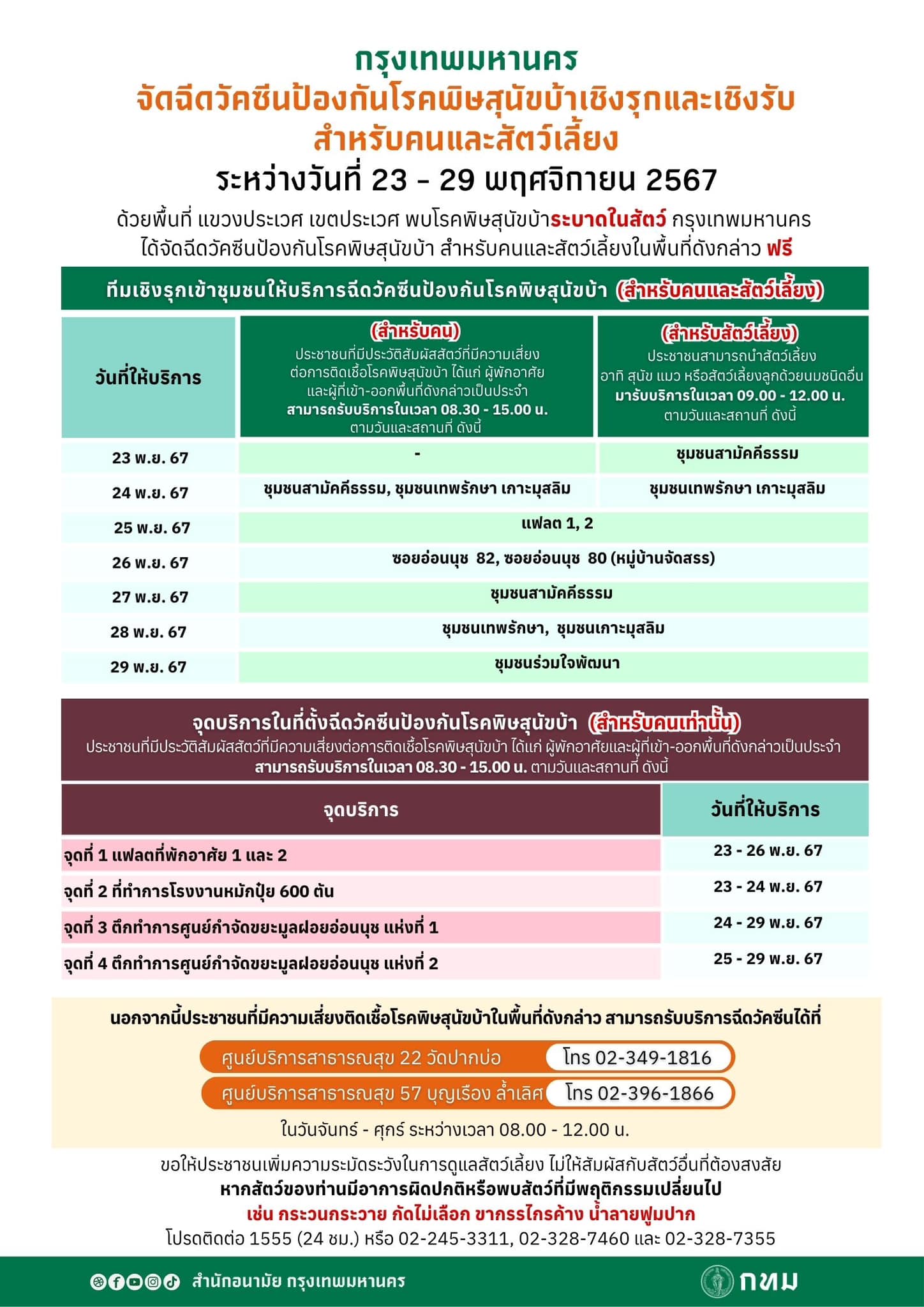 กรุงเทพมหานคร จัดฉีดวัคซีนป้องกันโรคพิษสุนัขบ้าเชิงรุกและเชิงรับ สำหรับคนและสัตว์เลี้ยง ตั้งแต่บัดนี้ – 29 พฤศจิกายน 2567 เนื่องจากพื้นที่ แขวงประเวศ เขตประเวศ พบโรคพิษสุนัขบ้าระบาดในสัตว์