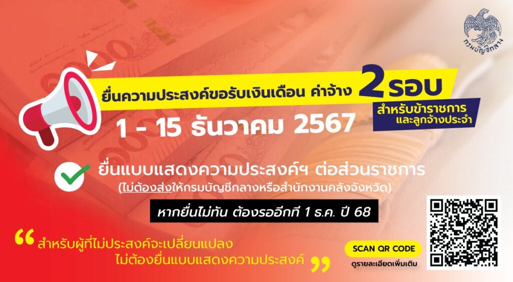 กรมบัญชีกลาง แจ้งข้าราชการ ลูกจ้างประจำ ที่ประสงค์ขอรับเงินเดือน 2 รอบ ยื่นความประสงค์ภายใน 1 – 15 ธ.ค. 67