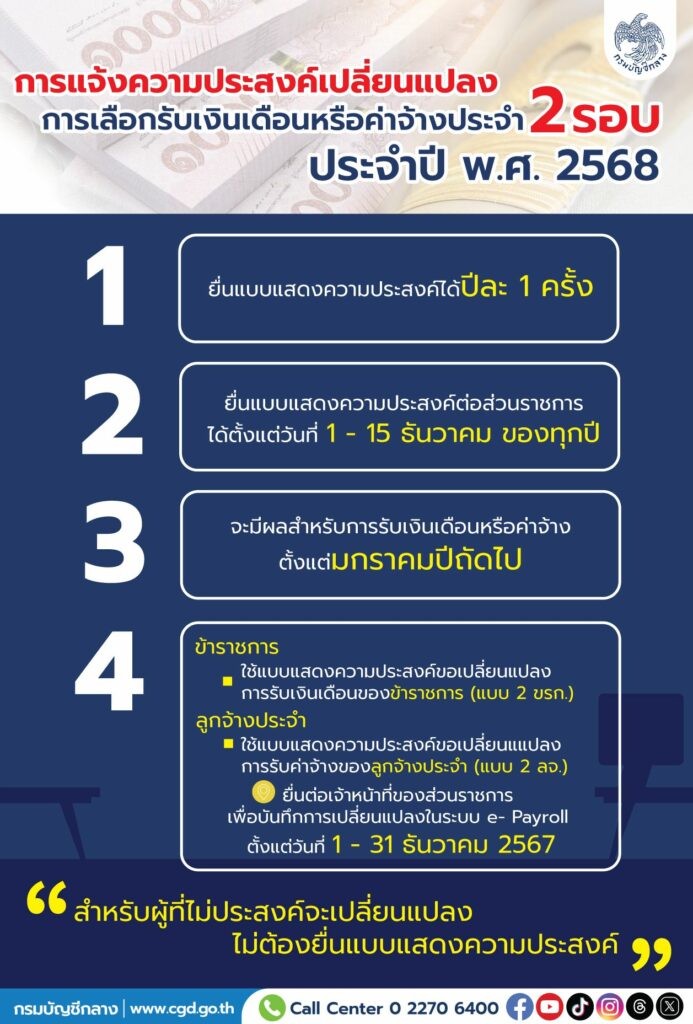 “ข้าราชการและลูกจ้างประจำ สามารถยื่นเอกสารแสดงความประสงค์ขอเปลี่ยนแปลงการรับเงินเดือนของข้าราชการและการรับค่าจ้างของลูกจ้างประจำ ได้ปีละ 1 ครั้ง โดยยื่นแบบแสดงความประสงค์ต่อส่วนราชการได้ตั้งแต่วันที่ 1 – 15 ธันวาคม ของทุกปี ซึ่งจะมีผลสำหรับการรับเงินเดือนหรือค่าจ้างตั้งแต่เดือนมกราคมปีถัดไป โดยใช้แบบแสดงความประสงค์ขอเปลี่ยนแปลงการรับเงินเดือนของข้าราชการ (แบบ 2 ขรก.) และแบบแสดงความประสงค์ขอเปลี่ยนแปลงการรับค่าจ้างของลูกจ้างประจำ (แบบ 2 ลจ.) ยื่นต่อเจ้าหน้าที่ของส่วนราชการ เพื่อบันทึกการเปลี่ยนแปลงในระบบ e -Payroll ตั้งแต่วันที่ 1 – 31 ธันวาคม 2567 หากพ้นระยะยะเวลาที่กำหนด ระบบจะปิดไม่ให้บันทึกรายการได้” โฆษกกรมบัญชีกลางกล่าว
