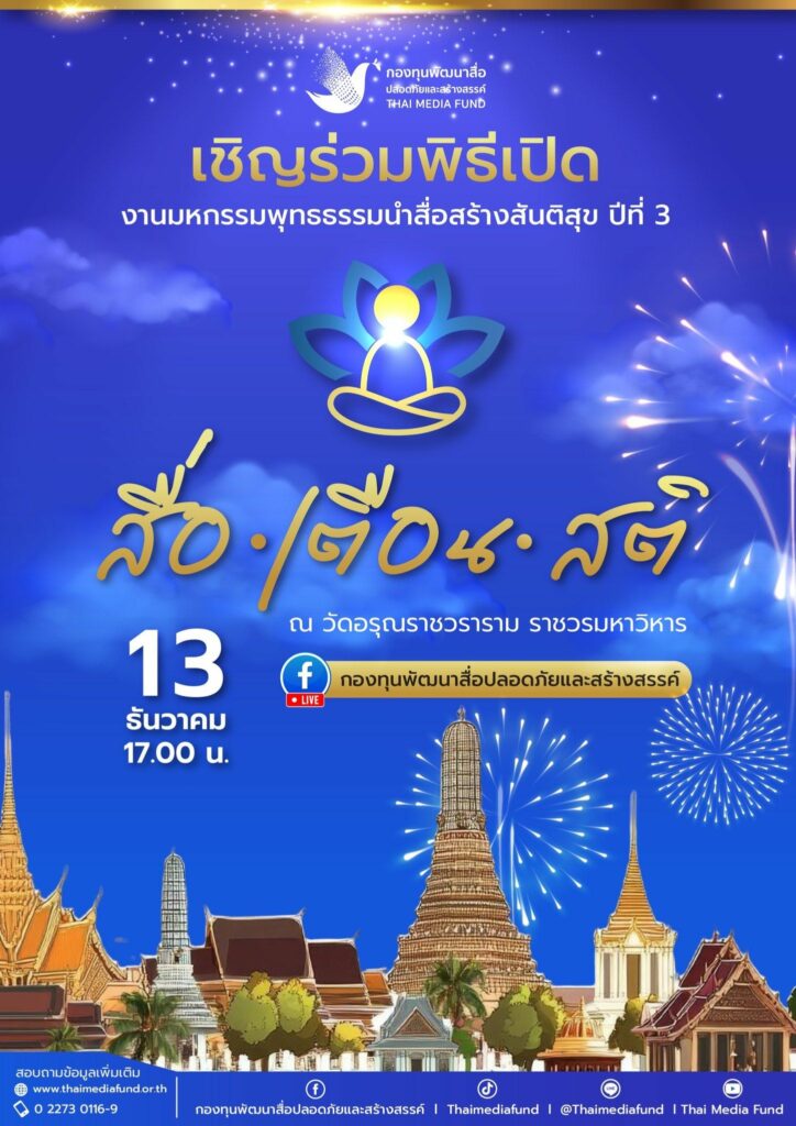 กระทรวงวัฒนธรรม โดยกองทุนพัฒนาสื่อปลอดภัยและสร้างสรรค์ จัดมหกรรมพุทธธรรมนำสื่อสร้างสันติสุข ปีที่ 3 “สื่อ เตือน สติ” เพื่อให้สอดคล้องกับยุคดิจิทัล จึงจัดกิจกรรมทั้งในรูปแบบ On Ground Event และ Online Event สร้างพื้นที่ให้เป็นแหล่งข้อมูลสำหรับสื่อส่งเสริมพระพุทธศาสนา เผยแพร่ให้ประชาชนทั้งภายในและต่างประเทศเข้าถึงสื่อส่งเสริมพระพุทธศาสนาได้ง่าย โดยการจัดงานพุทธธรรมนำสื่อสร้างสันติสุข ปี 3 จัดภายใต้แนวคิด “สื่อ เตือน สติ” เนื่องจากหากทุกคนมีสติจะเข้าใจและรับมือต่อการเปลี่ยนแปลงต่างๆ รอบตัว สามารถจัดการกับตัวเองได้ เช่น การเปิดรับข้อมูลข่าวสารอย่างมีสติ ไม่ตกเป็นเหยื่อของมิจฉาชีพ ไม่ตกเป็นเหยื่อของข่าวลวง ข่าวปลอม นำหลักธรรมมาช่วยรับมือกับสิ่งที่รอบตัว เพราะหลักธรรมในพุทธศาสนาสามารถขับเคลื่อนสังคมให้น่าอยู่