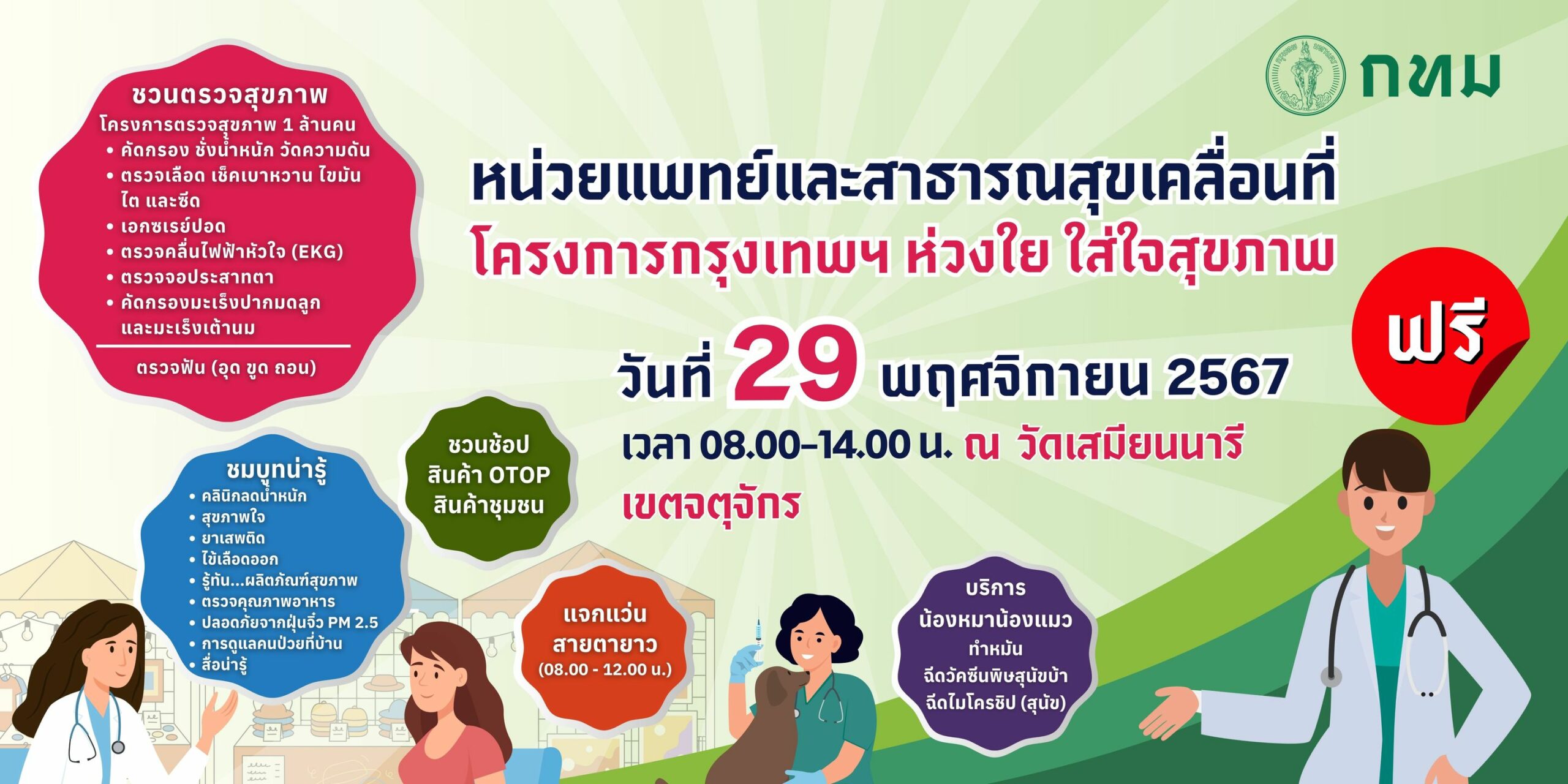 กรุงเทพมหานคร เชิญร่วมกิจกรรมบริการสุขภาพเคลื่อนที่ ตรวจสุขภาพฟรี ในวันที่ 29 พฤศจิกายน 2567 ตั้งแต่เวลา 08.00 – 14.00 น. ณ วัดเสมียนนารี เขตจตุจักร