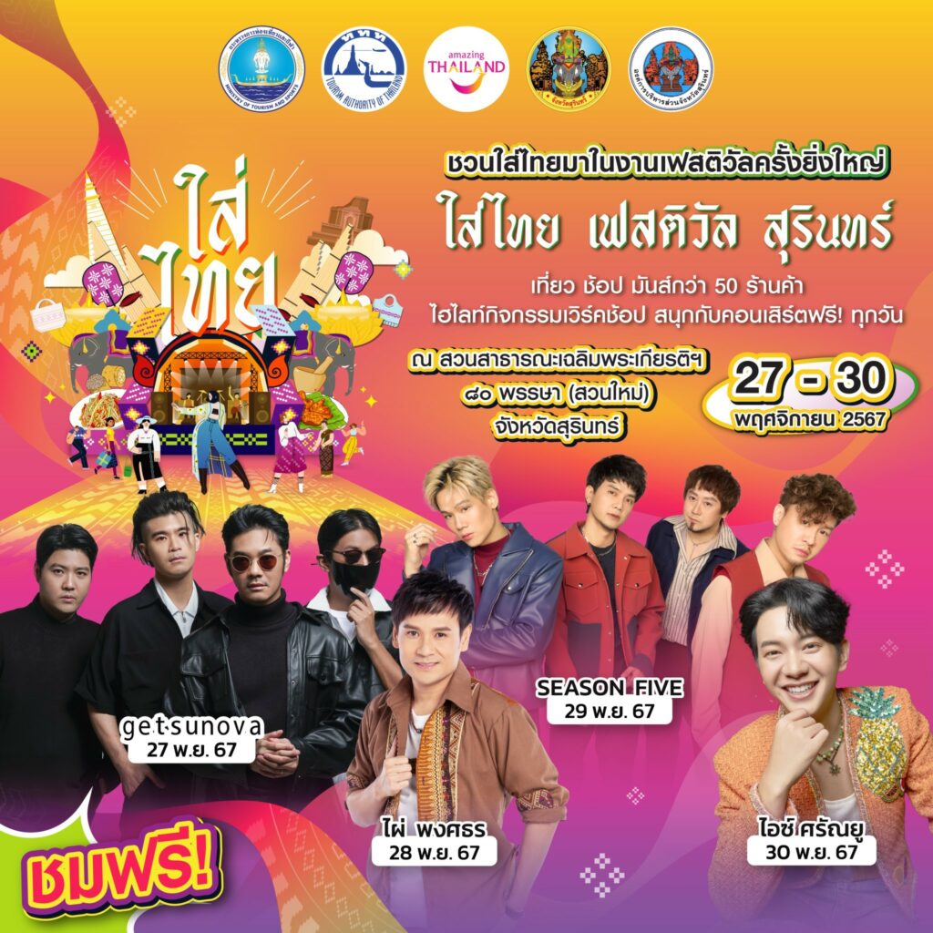 การท่องเที่ยวแห่งประเทศไทย จัดงานเฟสติวัลครั้งยิ่งใหญ่ “ใส่ไทย เฟสติวัล”จังหวัดสุรินทร์ วันที่ 27 – 30 พฤศจิกายน 2567 ณ สวนเฉลิมพระเกียรติ 80 พรรษา (สวนใหม่) อำเภอเมือง จังหวัดสุรินทร์